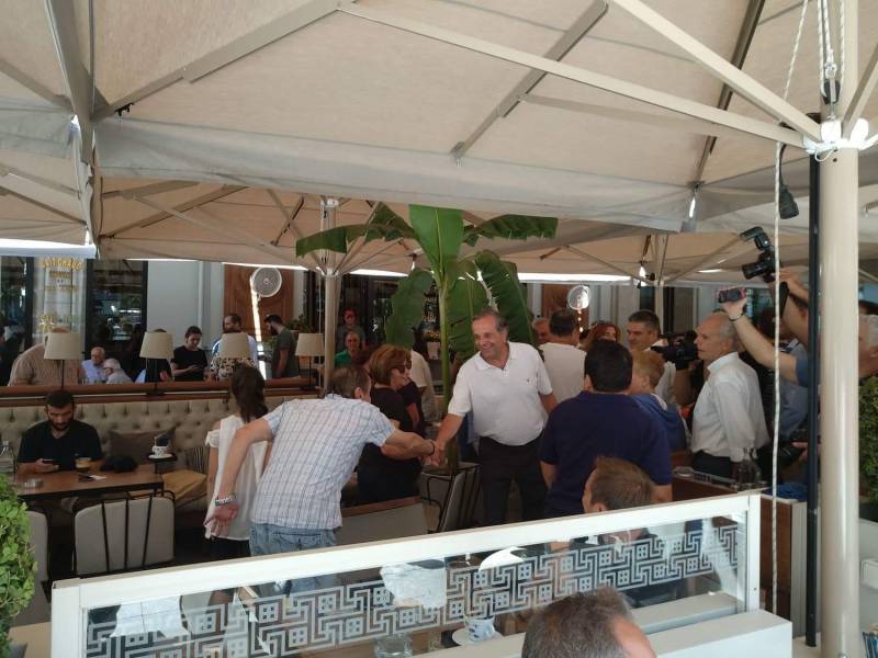 Βρίσκεται στο καφέ "Platea" και μαζί του μεταξύ άλλων είναι η αντιπεριφερειάρχης Μεσσηνίας Ελένη Αλειφέρη, η πρόεδρος της ΝΟΔΕ Νατάσα Κυριακοπούλου, η πρόεδρος της ΔΗΜΤΟ Καλαμάτας Άντζελα Σκλήκα, ο αντιδήμαρχος Καλαμάτας Παναγιώτης Γιαννόπουλος, ο περιφερειακός σύμβουλος Περικλής Μαντάς, ο πολιτευτής Μίλτος Χρυσομάλλης και η Πιπίνα Κουμάντου.