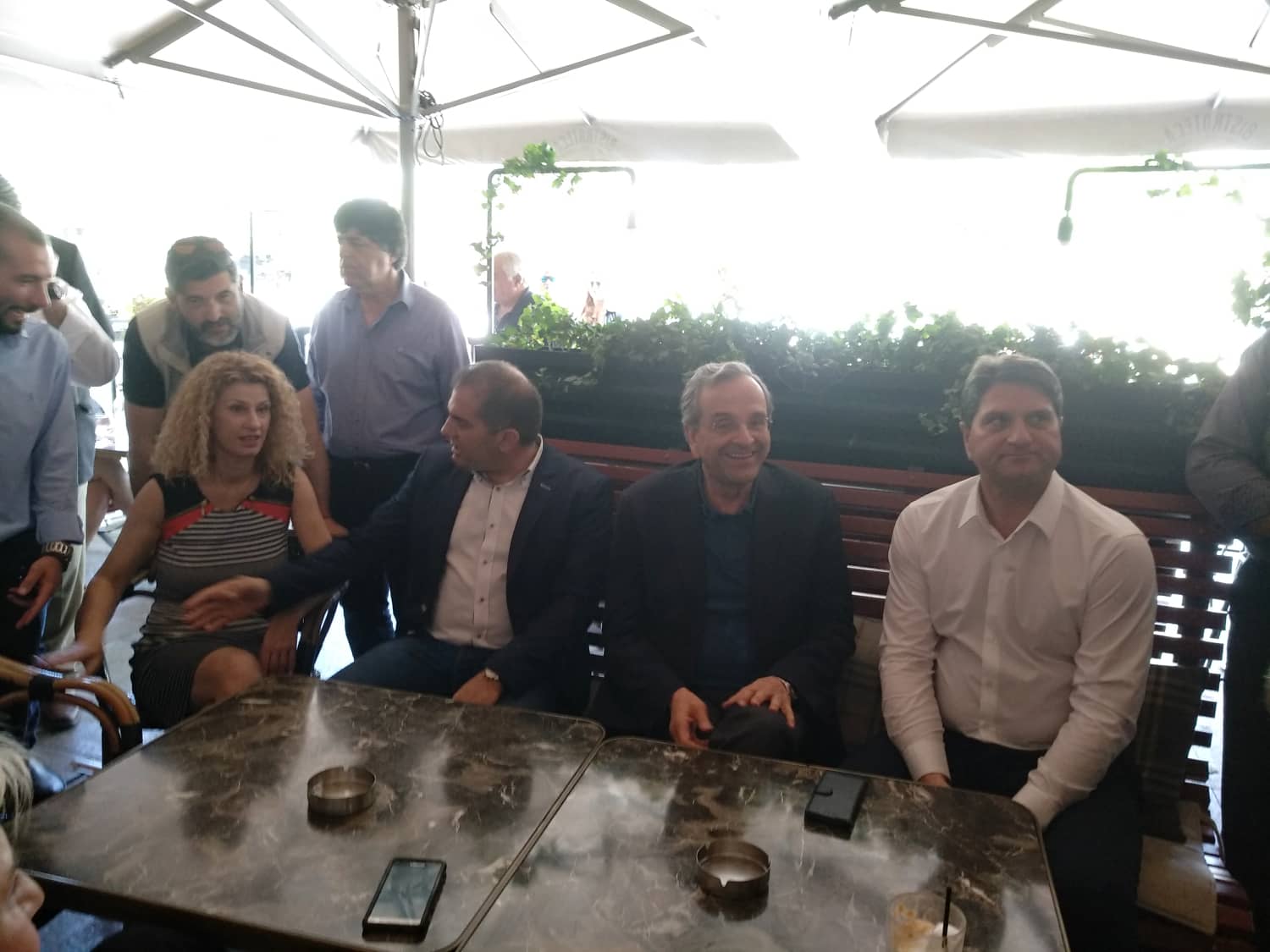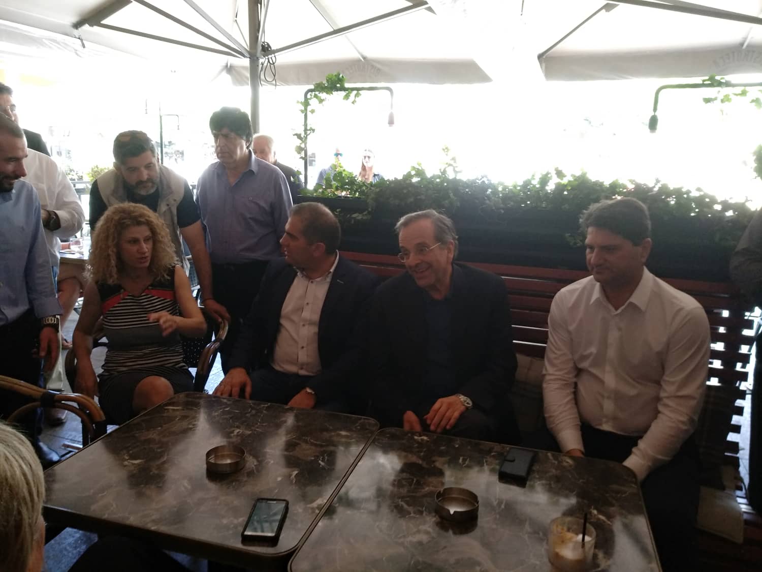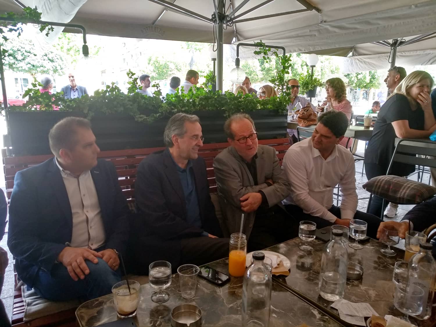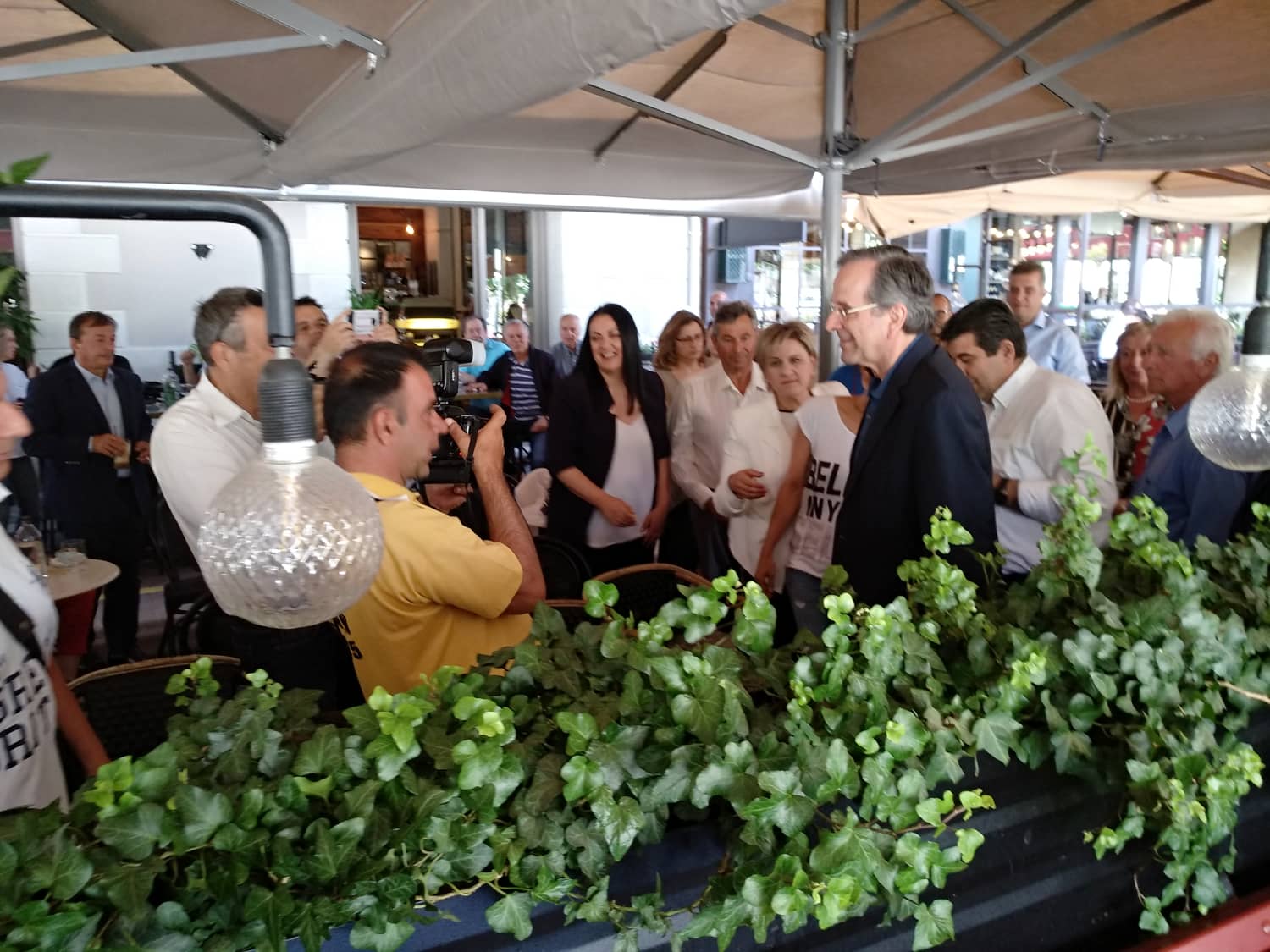 Συνοδευόμενος από τον νέο δήμαρχο Μεσσήνης Γιώργο Αθανασόπουλο, τον υποψήφιο δήμαρχο Καλαμάτας Θανάση Βασιλόπουλο, τοπικά στελέχη της ΝΔ και φίλους βρίσκεται στο καφέ "Bistroteca" λίγες ώρες πριν τον κρίσιμο β' γύρο των δημοτικών και των περιφερειακών εκλογών. Στην συνάντηση με ορισμένη καθυστέρηση βρέθηκε και ο υποψήφιος περιφερειάρχης Πελοποννήσου Παναγιώτης Νίκας, που νωρίτερα βρέθηκε στην Τριφυλία.
