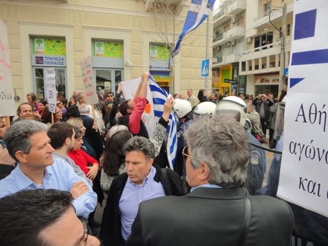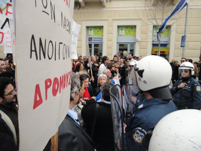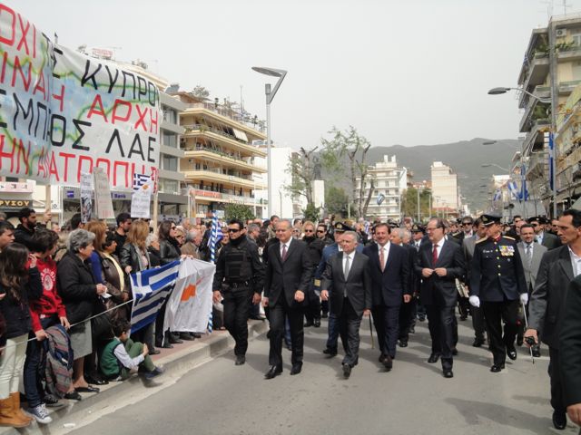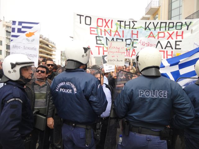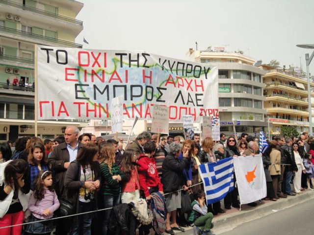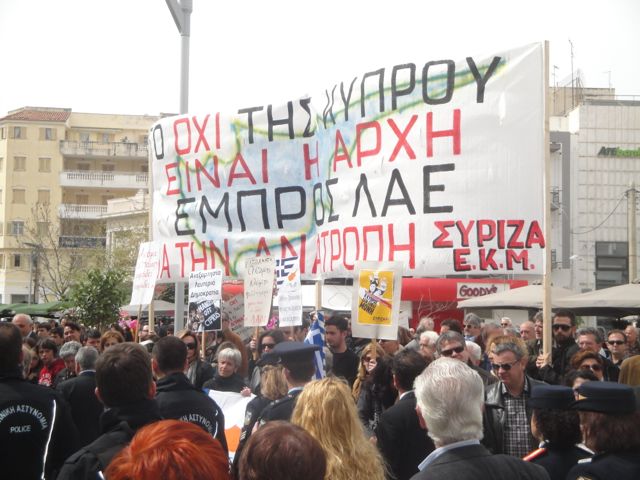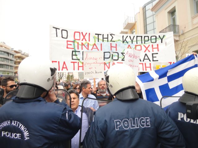 Σημειώθηκαν σπρωξίματα κι επικράτησε ένταση, αλλά τελικά οι αστυνομικοί έκαναν στην άκρη και οι διαδηλωτές πραγματοποίησαν πορεία, φωνάζοντας συνθήματα στήριξης και αλληλεγγύης στον Κυπριακό λαό, αλλά και αποδοκιμασίας κατά της τρόικας και της κυβέρνησης. Κατέληξαν στα μνημεία των πεσόντων αξιωματικών στην Κυπριακή εισβολή του 1974, αποτίοντας συμβολικά φόρο τιμής. Κατά τη διάρκεια της παρέλασης τα μέλη του ΣΥΡΙΖΑ είχαν συγκεντρωθεί στο πεζοδρόμιο απέναντι από την Τράπεζα Πειραιώς, με πανό και πλακάτ, φωνάζοντας συνθήματα. Απέναντι είχε συγκεντρωθεί ομάδα μελών του ΕΠΑΜ με πανό, τα οποία πήραν μέρος και στην πορεία διαμαρτυρίας.