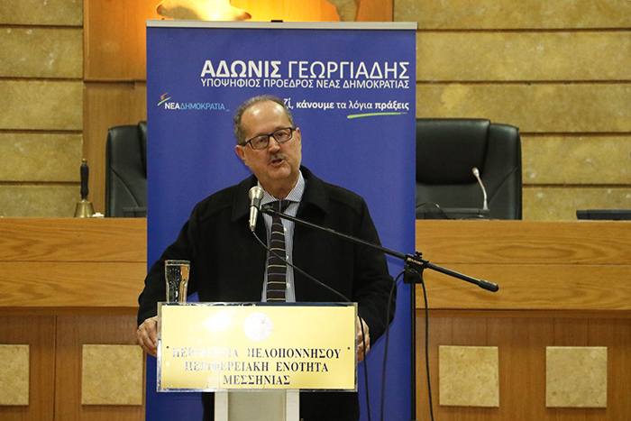 Τον Α. Γεωργιάδη, τόσο στη συνέντευξη, όσο και στην ομιλία του, προλόγισε ο πρόεδρος της ΝΟΔΕ Μεσσηνίας της Ν.Δ. Περικλής Μαντάς, δηλώνοντας “ιδιαίτερα ευτυχής που συμμετείχα με την υπογραφή μου στην υποψηφιότητά του”, θυμίζοντας παράλληλα στον υποψήφιο πρόεδρο του κόμματος ότι βρίσκεται “στην πατρίδα ενός από τους πιο πετυχημένους πρωθυπουργούς της Ελλάδας, του Αντώνη Σαμαρά, ο οποίος δικαιώνεται, όσο περνά ο χρόνος”.