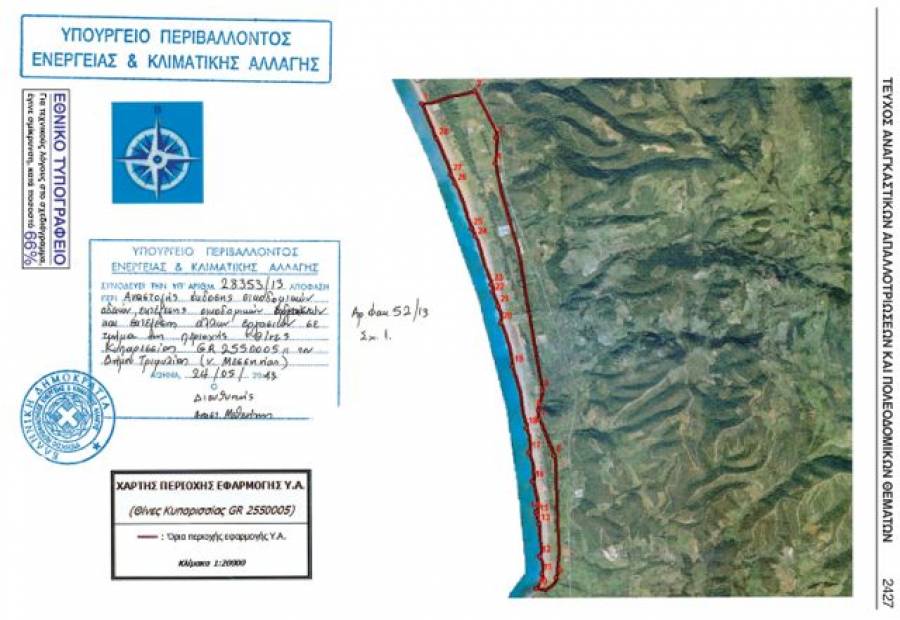 Στην απόφαση μεταξύ άλλων αναφέρεται: "Αναστέλλεται μέχρι την έκδοση της Υπουργικήςαπόφασης Προσωρινής προστασίας βάσει του άρθρου 9του Ν. 3937/2011 σε τμήμα της περιοχής .Θίνες Κυπαρισσίας GR 2550005. του Δήμου Τριφυλίας (Ν. Μεσσηνίας):α) Η έκδοση οικοδομικών αδειών.β) Η έγκριση εργασιών μικρής κλίμακας, όσον αφορά στις περιπτώσεις: δοκιμαστικών τομών του εδάφουςκαι εκσκαφής, κατασκευής αποθηκών σε νέα καλλιεργούμενα αγροκτήματα, αντλητικές εγκαταστάσεις και κτίσματα, γεωτρήσεις νερού. γ) Η εκτέλεση εργασιών βάσει 48ωρης ενημέρωσης που αφορούν σε: απλή περιτοίχιση ή περίφραξη γηπέδων, κατασκευή ξύλινης πέργκολας και πλατφόρμας σε ακάλυπτους χώρους, καθώς και μικρές διαμορφώσεις του εδάφους. δ) Η εκτέλεση έργων και επεμβάσεων, όπως αγροτικές καλλιέργειες στις περιοχές που βρίσκονται μεταξύ τουαιγιαλού και του πευκοδάσους, αμμοληψίες, διάνοιξη και επίστρωση δρόμων, μηχανικός καθαρισμός της παραλίας, τοποθέτηση διαδρόμων διέλευσης πεζών, έργα αποστράγγισης καλλιεργούμενων εκτάσεων και γενικά όσων δραστηριοτήτων βλάπτουν το προοτατευτέο αντικείμενο και την ακεραιότητα της περιοχής προστασίας."