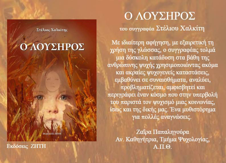 Ο κ. Στέλιος Χαλκίτης με αυτό το συναρπαστικό μυθιστόρημα προσφέρει-δωρίζει στο αναγνωστικό κοινό ένα ακόμη απόκτημα που φέρει τον τίτλο «Ο Λούσηρος» με έντονα άσπρα γράμματα στο εξώφυλλο, σε γήινο φόντο, όπου δύο γυναικείες μορφές δεσπόζουν, ενώ μια τρίτη δυσδιάκριτη, αναδεικνύεται μέσα από τα στάχυα που το πλαισιώνουν.
