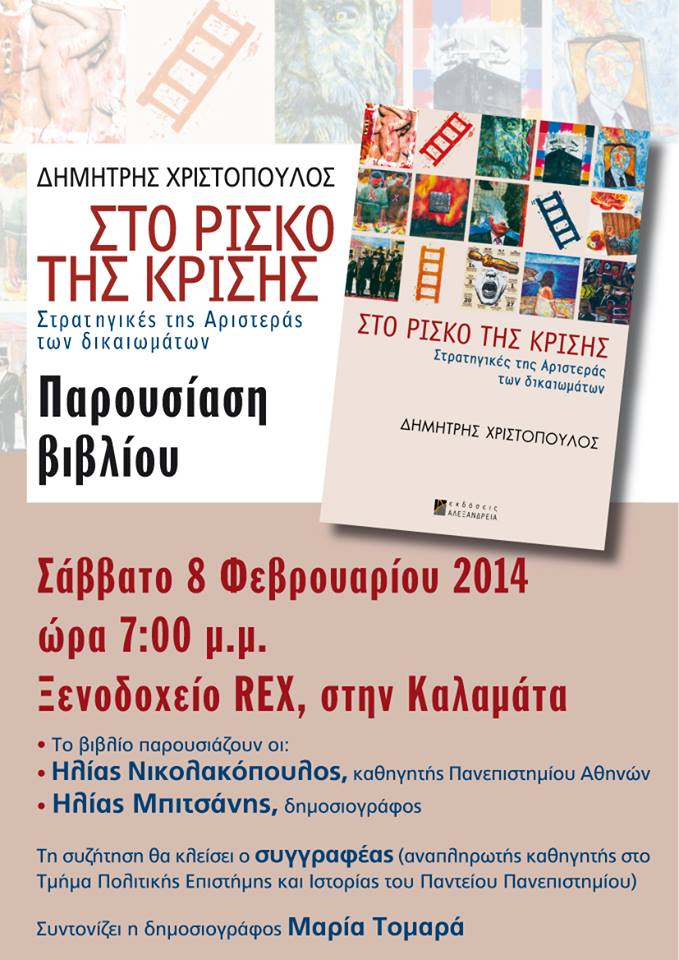 Το βιβλίο, που κυκλοφορεί από τις εκδόσεις Αλεξάνδρεια, θα παρουσιάσουν ο καθηγητής του Πανεπιστημίου Αθηνών Ηλίας Νικολακόπουλος και ο δημοσιογράφος Ηλίας Μπιτσάνης. Τη συζήτηση θα κλείσει ο ίδιος ο συγγραφέας, ενώ το συντονισμό θα έχει η δημοσιογράφος Μαρία Τομαρά. Η παρουσίαση θα ξεκινήσει στις 7 μ.μ. και θα λάβει χώρα στο ξενοδοχείο Rex.