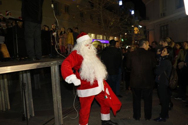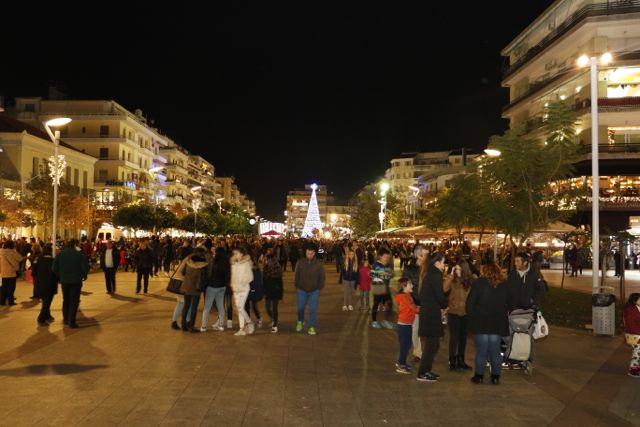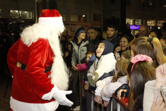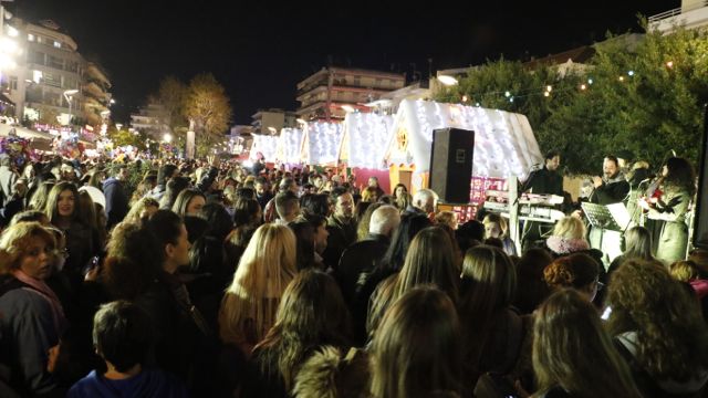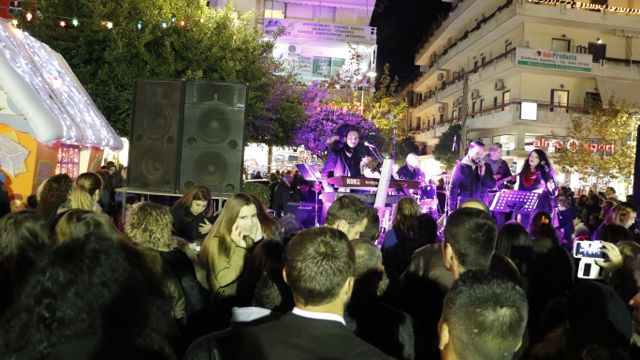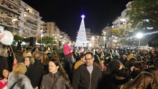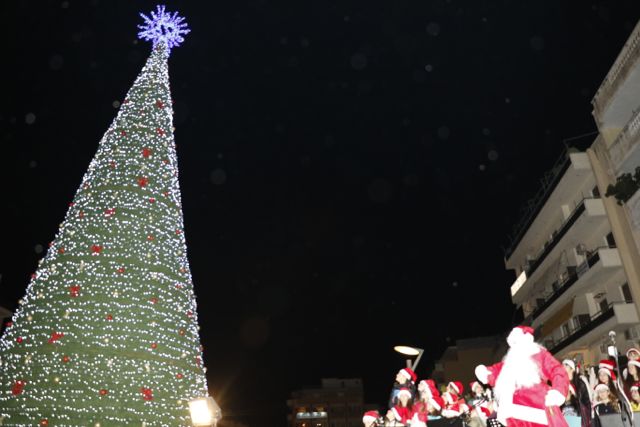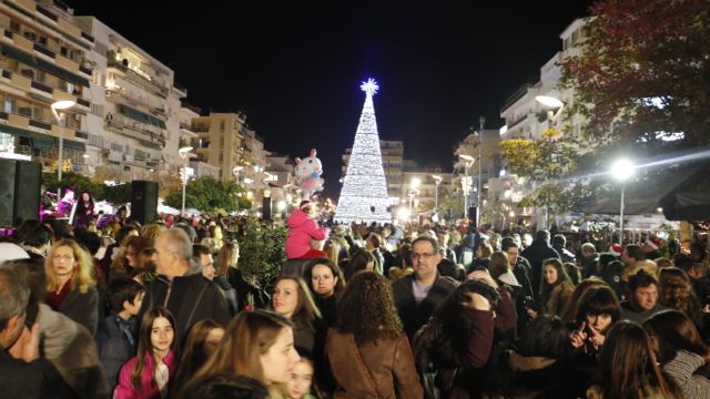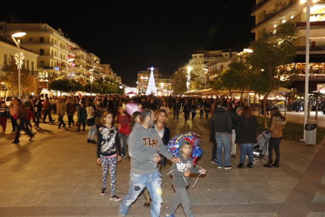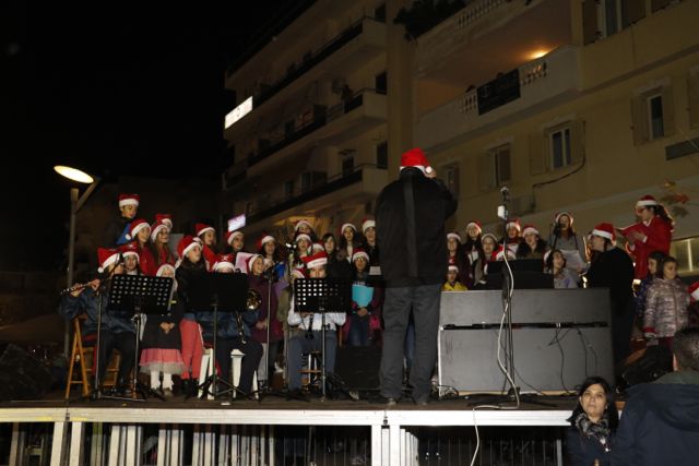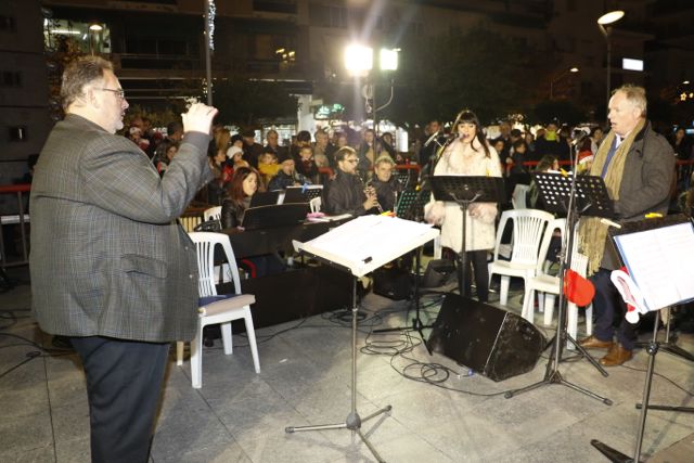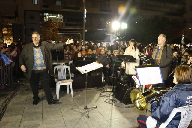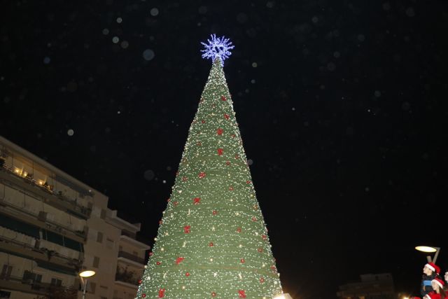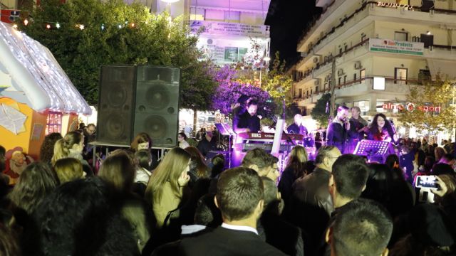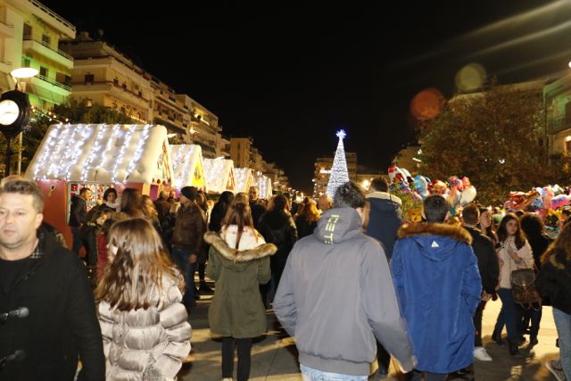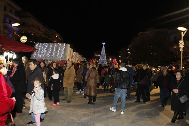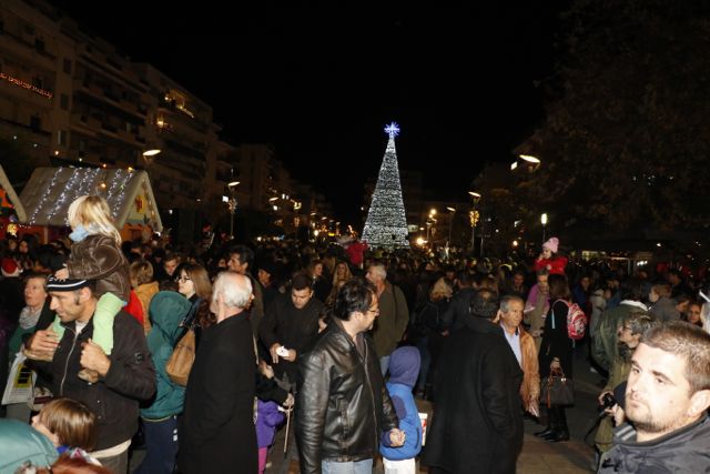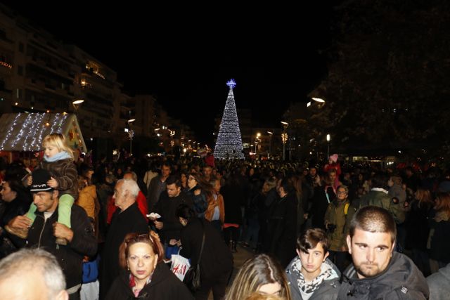 Η φωταγώγηση έγινε με τη συνοδεία πυροτεχνημάτων, παρουσία παιδιών κάθε ηλικίας, αλλά και μεγάλων, που είχαν κατακλύσει την πλατεία.
