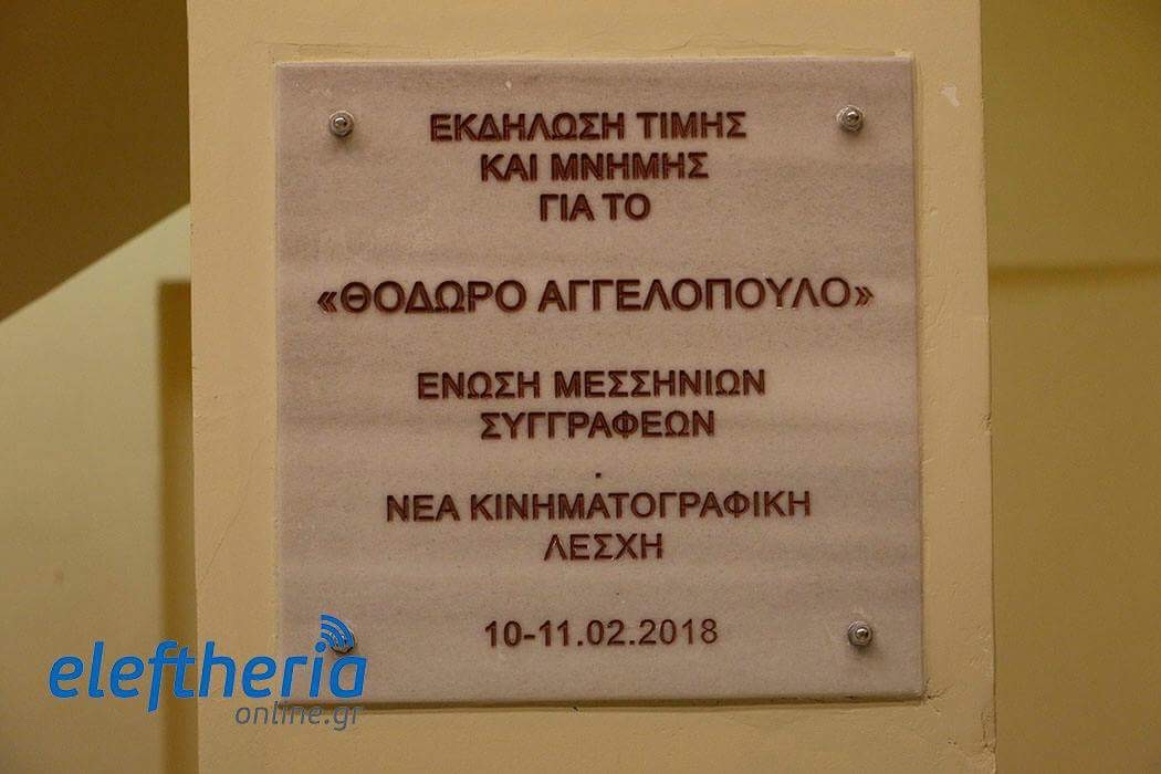 Χθες Σάββατο οι εκδηλώσεις άνοιξαν με την αποκάλυψη αναμνηστικής πλάκας στην είσοδο του αμφιθεάτρου «Θ. Αγγελόπουλος», από το δήμαρχο Καλαμάτας Παναγιώτη Νίκα, παρουσία της βουλευτού Μεσσηνίας Γιώτας Κοζομπόλη και του πρώην βουλευτή του νομού Θανάση Πετράκου. Παρούσα ήταν σύσσωμη η οικογένεια Αγγελόπουλου, που ήρθε για να τιμήσει την πόλη και το νομό, απ' όπου κατάγεται από την πλευρά του πατέρα του ο Ελληνας σκηνοθέτης.
