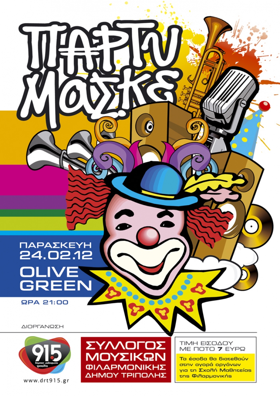 Ένα πάρτυ μασκέ έχουν ετοιμάσει, από κοινού, οι εργαζόμενοι της Δημοτικής Ραδιοφωνίας Τρίπολης 91.5 και της Φιλαρμονικής του Δήμου Τρίπολης, για την Παρασκευή, 24 Φεβρουαρίου 2012, στο olive green στις 21.00.