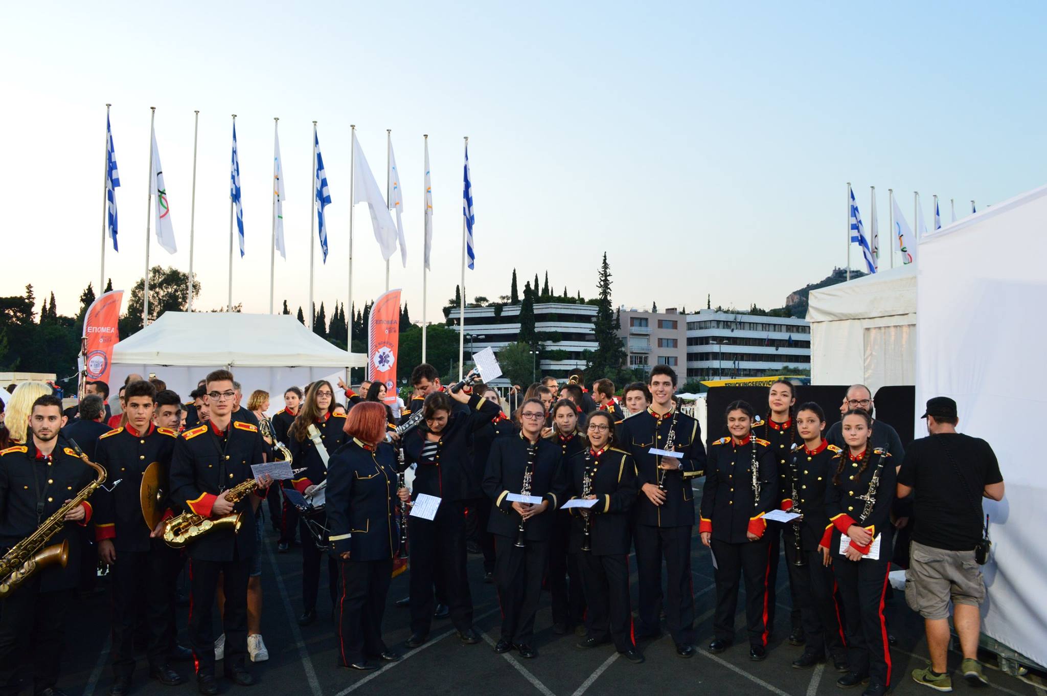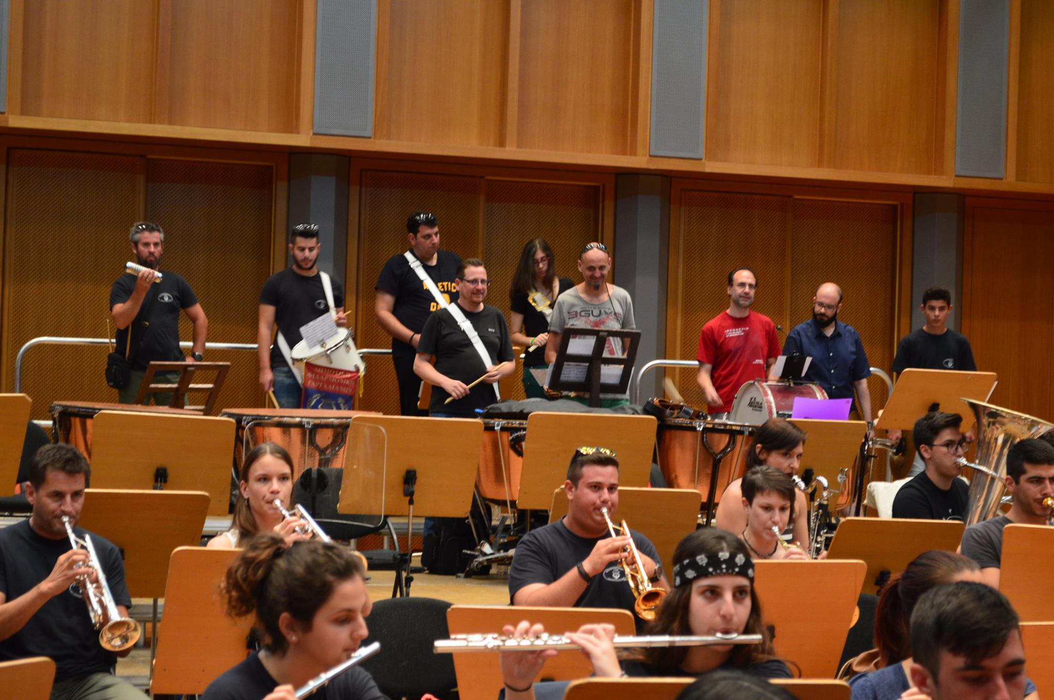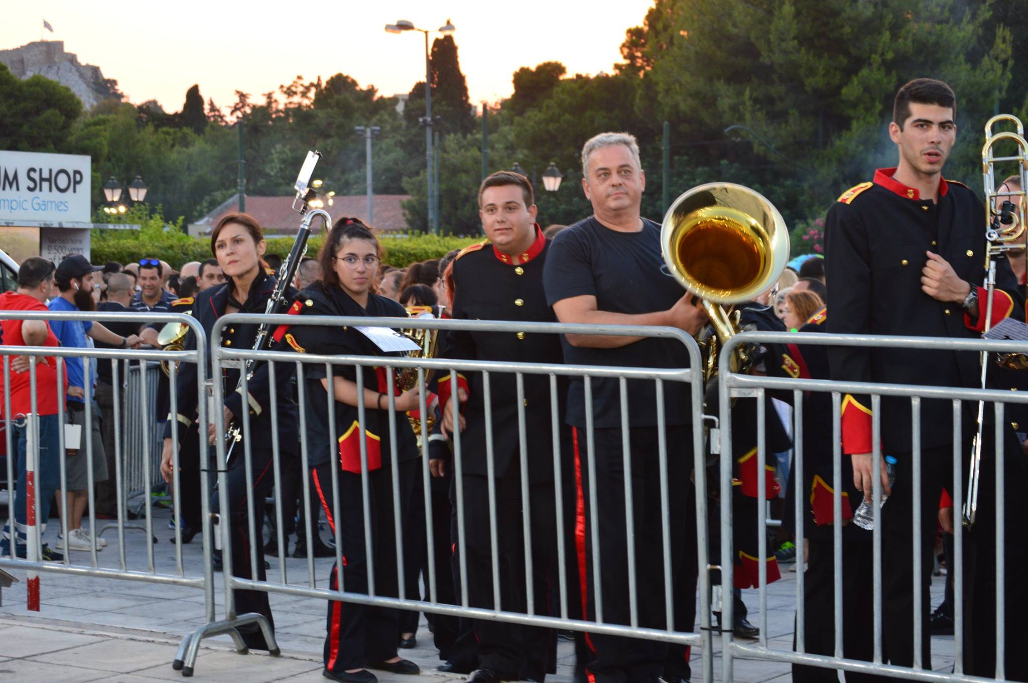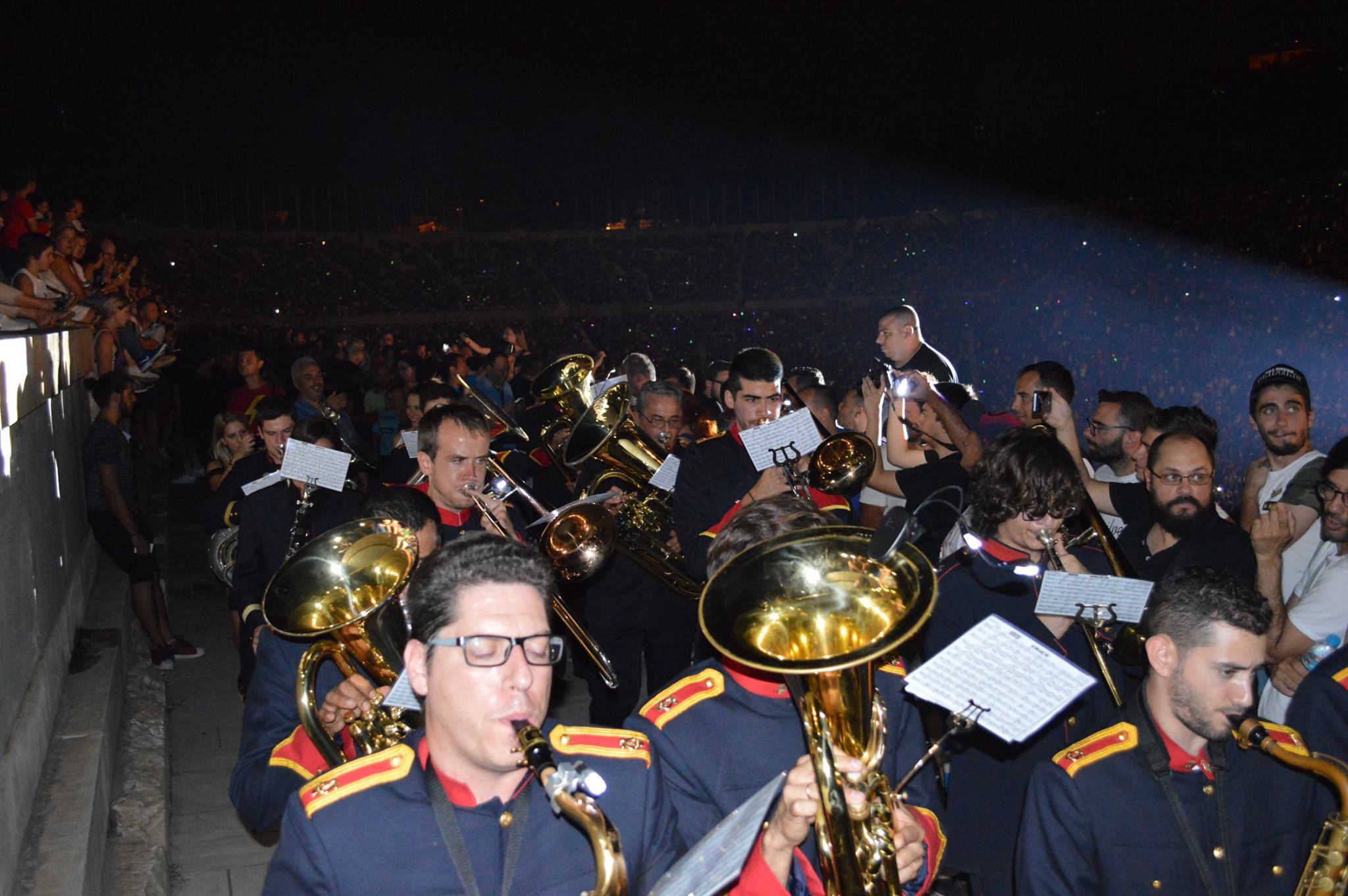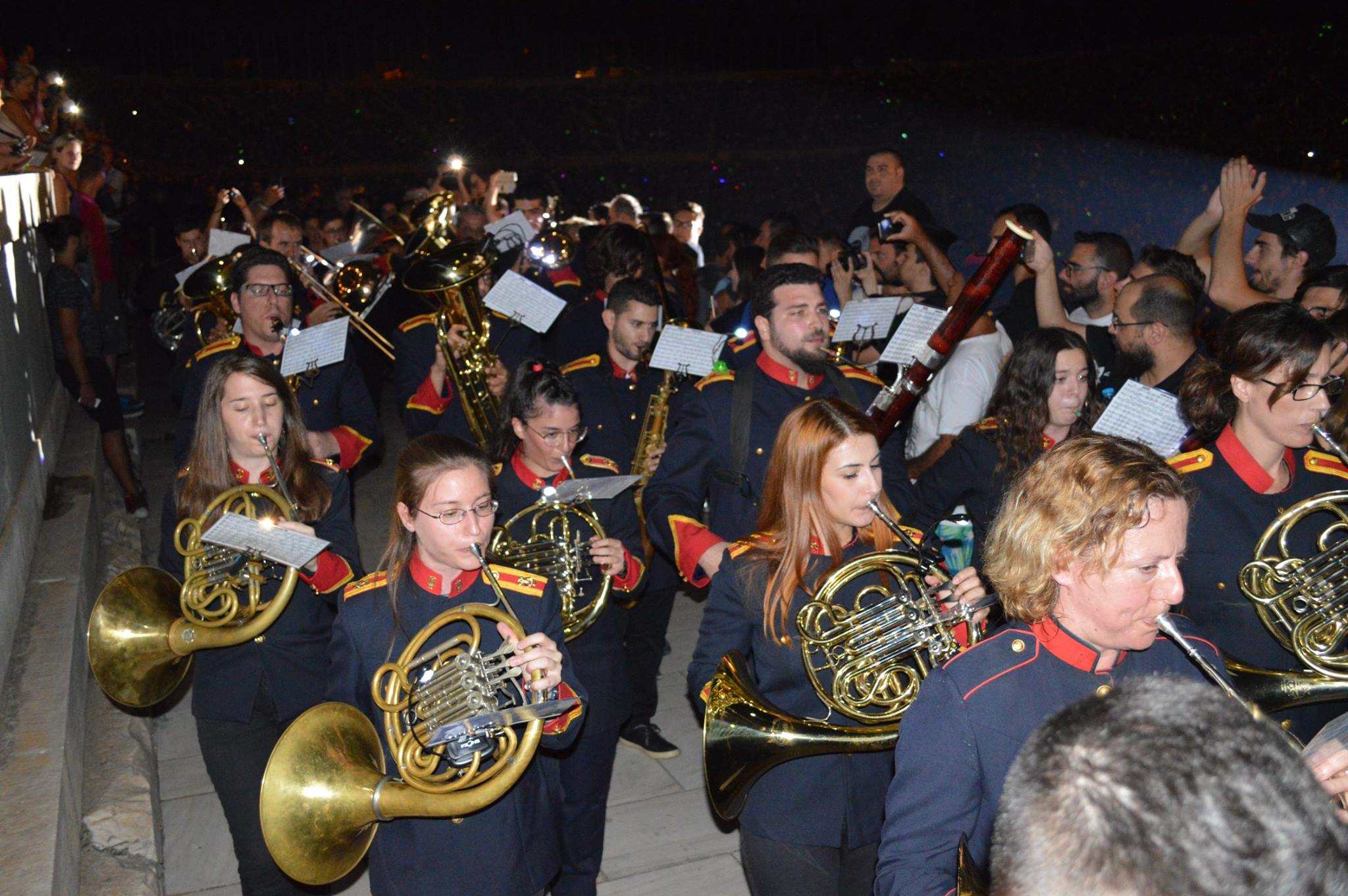 Αρχικώς όλοι οι μουσικοί μας έζησαν μια μοναδική εμπειρία κατά τη διάρκεια της πρόβας μας στην αίθουσα δοκιμών της Κρατικής Ορχήστρας του Μεγάρου Μουσικής Αθηνών. Ύστερα μεταβήκαμε στο χώρο του Καλλιμάρμαρου Σταδίου όπου παίξαμε και δώσαμε τον καλύτερό μας εαυτό σε δύο από τα γνωστότερα τραγούδια του συγκροτήματος , το: «Moment of Glory» και το « Νo οne like you» ενορχηστρωμένα και προσαρμοσμένα σε ορχήστα πνευστών από τον φίλο και αρχιμουσικό κ. Παναγιώτη Βλάχο.