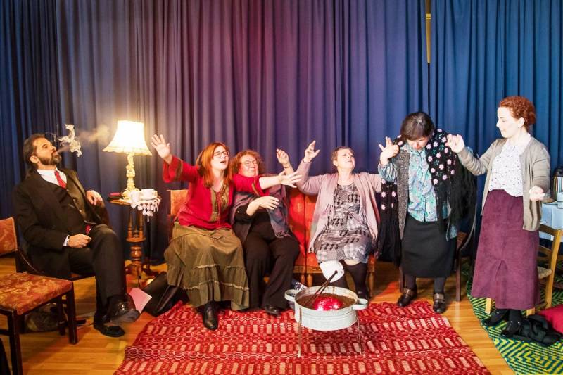 Με την κουβέντα γύρω από ένα μαγκάλι, βγάζουν στην επιφάνεια το βαθύ συντηρητισμό τους, τη θρησκοληψία τους, τις πολιτικές τους αντιπαραθέσεις με τα μικροσυμφέροντα που τις χαρακτηρίζουν, το άγχος της περασμένης ηλικίας τους και τα αδιέξοδά τους. Κυρίως όμως αποτυπώνεται το πολιτιστικό τους κενό.