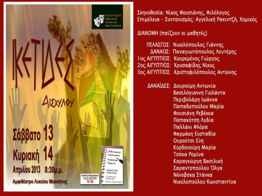 Παράλληλα η τραγωδία θα παρουσιαστεί και στις 24 Απριλίου στος 11:30 π.μ. στο Εκκλησιαστήριο της Αρχαίας Μεσσήνης στο πλαίσιο του 2ου Διεθνούς Μαθητικού Φεστιβάλ Αρχαίου Δράματος. Αρχαίας Μεσσήνης 2013.