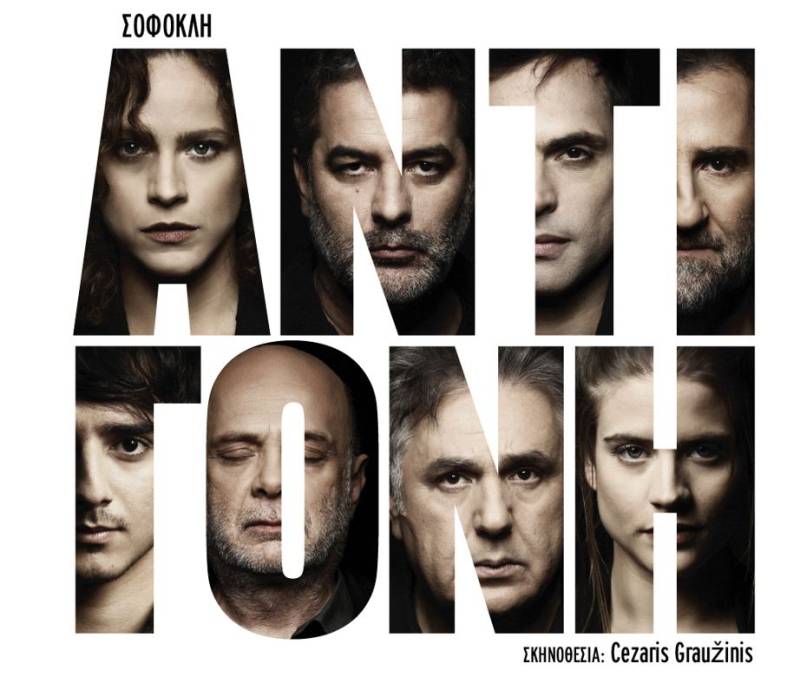 Μετάφραση: Γιώργος Μπλάνας, Σκηνοθεσία: Cezaris Graužinis, Σκηνογραφία – Ενδυματολογία: Kenny MacLellan, Μουσική σύνθεση: Δημήτρης Θεοχάρης, Χορογραφία: Edgen Lame, Φωτισμοί: Αλέκος Γιάνναρος, Φωτογραφίες: Πάνος Γιαννακόπουλος. Πρωταγωνιστούν: Έλλη Τρίγγου (Αντιγόνη), Βασίλης Μπισμπίκης (Κρέων), Ιεροκλής Μιχαηλίδης (Κορυφαίος του Χορού), Γιώργος Παπαγεωργίου (Άγγελος), Δανάη Μιχαλάκη (Ισμήνη), Χρήστος Σαπουντζής (Τειρεσίας), Κώστας Κορωναίος (Φύλακας), Στρατής Χατζησταματίου (Αίμων), Μαρίνα Αργυρίδου (Ευριδίκη), Γιάννης Μαστρογιάννης (Χορός), Περικλής Σιούντας (Χορός), Edgen Lame (Χορός). Προπώληση στο ticketservices.gr, στο Πνευματικό κέντρο και στο ταμείο του θεάτρου. Τα εισιτήρια κοστίζουν 17 ευρώ.