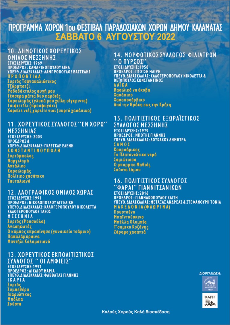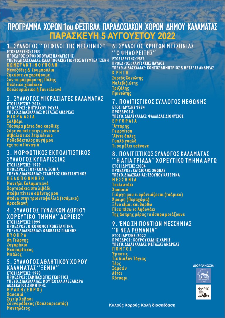 Κατά το διήμερο των εκδηλώσεων θα παρουσιαστούν χοροί και τραγούδια απ’ όλη την Ελλάδα και από τις χαμένες Πατρίδες. Οι εκδηλώσεις του 1ου Ανταμώματος Παραδοσιακών Χορών εντάσσονται στο πλαίσιο του Πολιτιστικού Καλοκαιριού 2022 που διοργανώνει ο Δήμος Καλαμάτας και η Κ.Ε. «Φάρις».