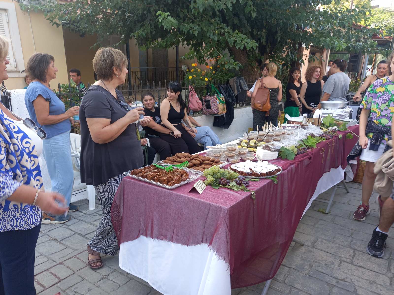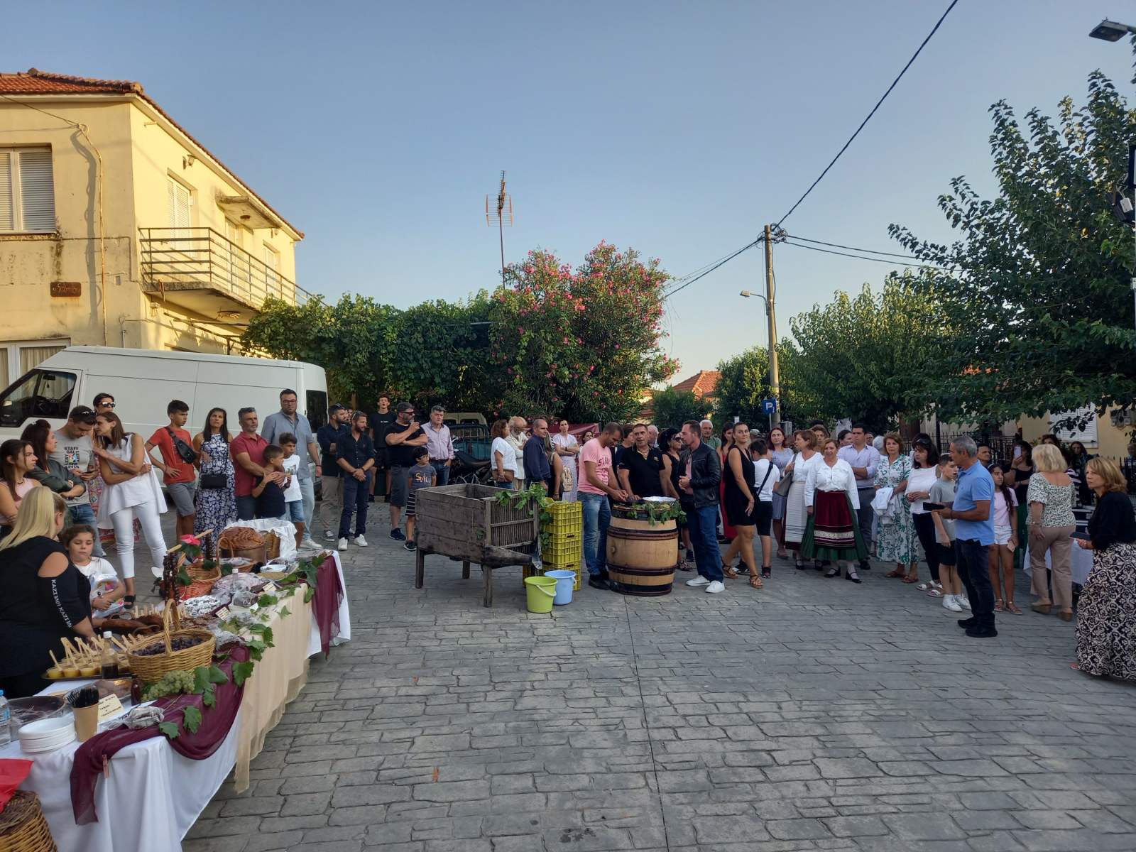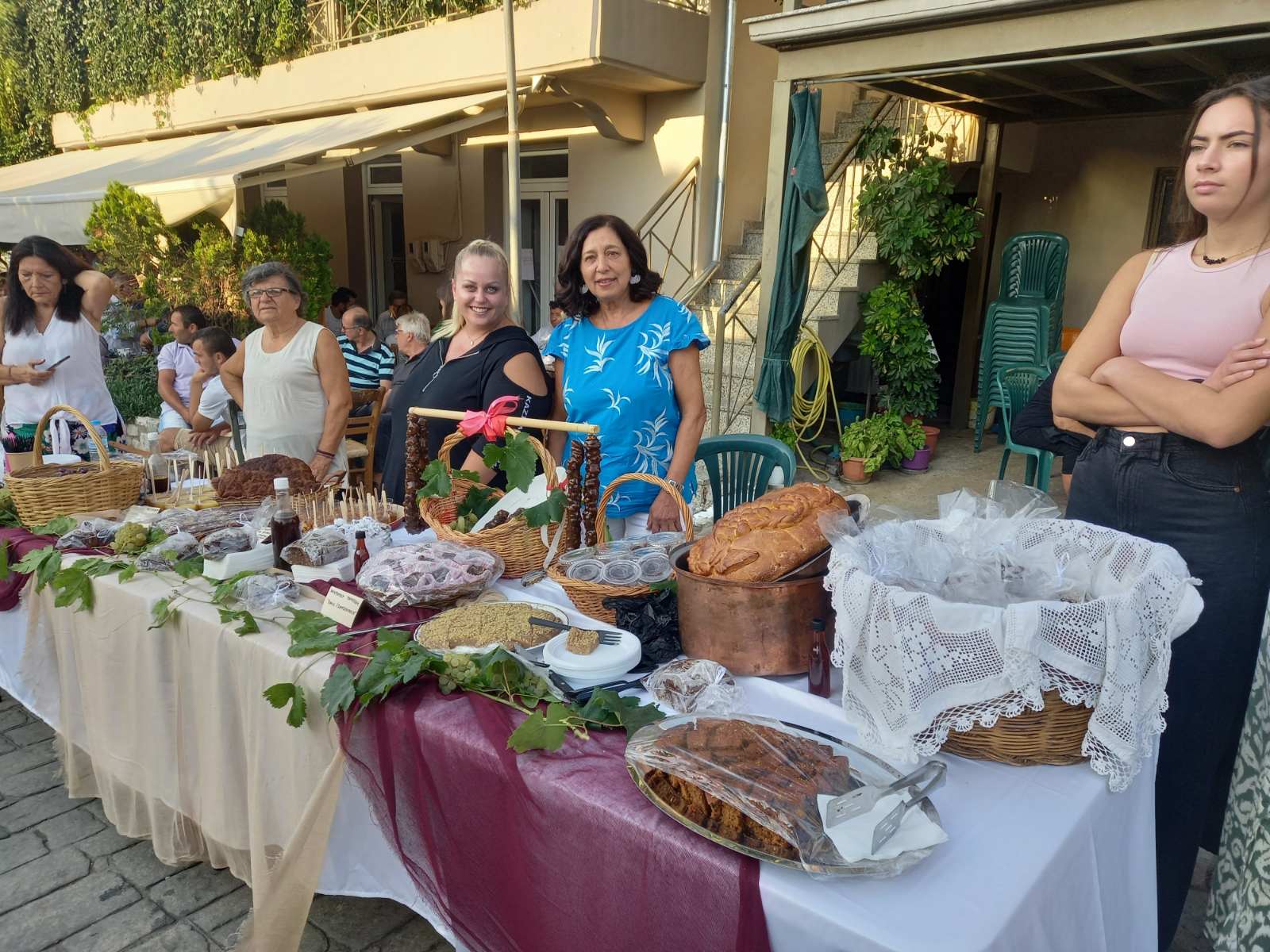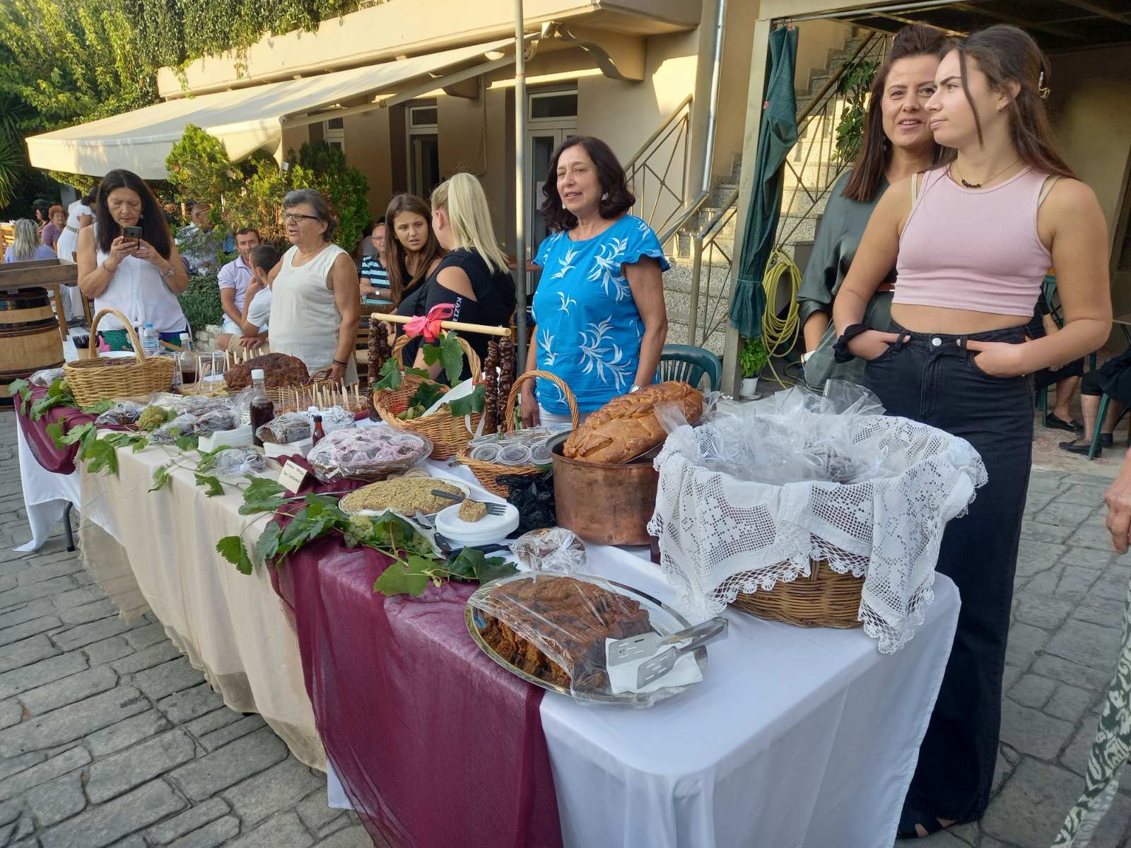 Στην πλατεία του χωριού, που φημίζεται για τα αμπέλια του και για το καλό κρασί που παράγει, είχαν στηθεί αρκετοί μπουφέδες με παραδοσιακά εδέσματα που είχαν φτιάξει με μεράκι οι γυναίκες του χωριού. Εδέσματα από σταφύλι, σταφίδα και πετιμέζι, ενώ πάνω σε βαρέλια υπήρχαν σταφύλια και πολλές ποικιλίες κρασιών, που μπορούσε να γευτεί ο κόσμος.