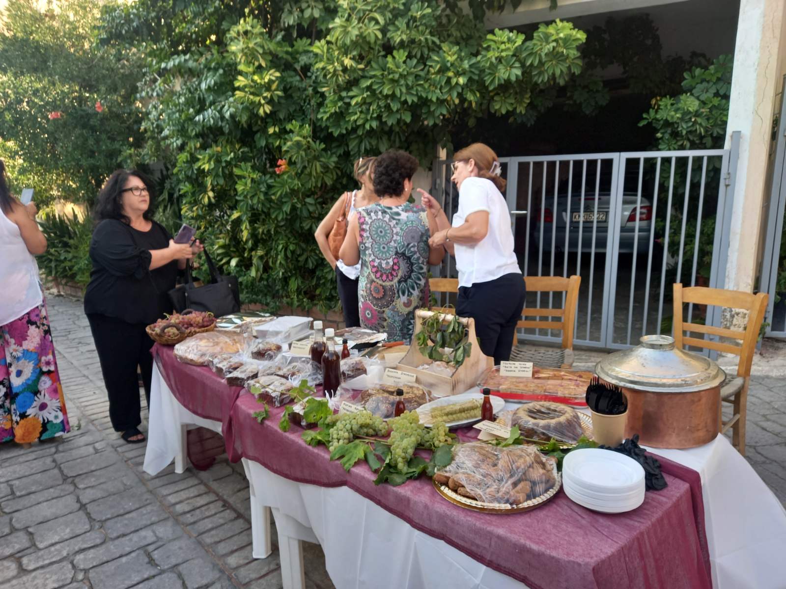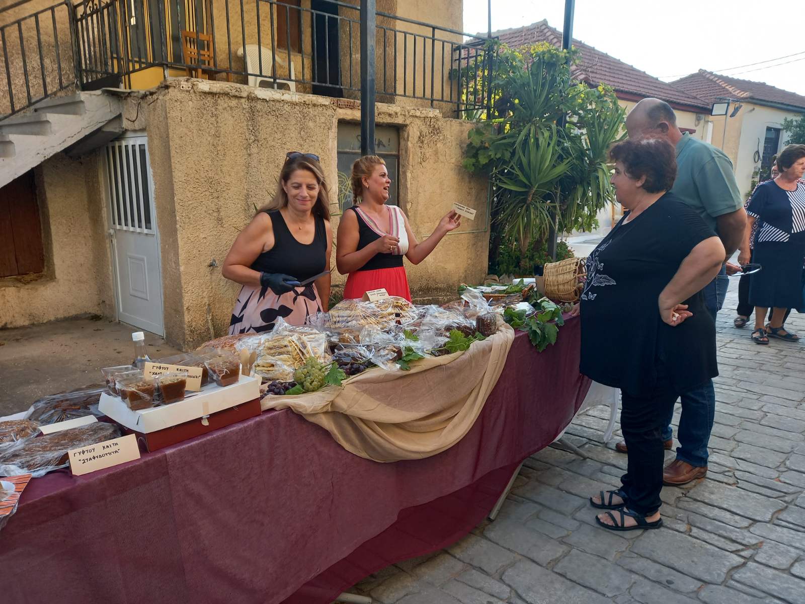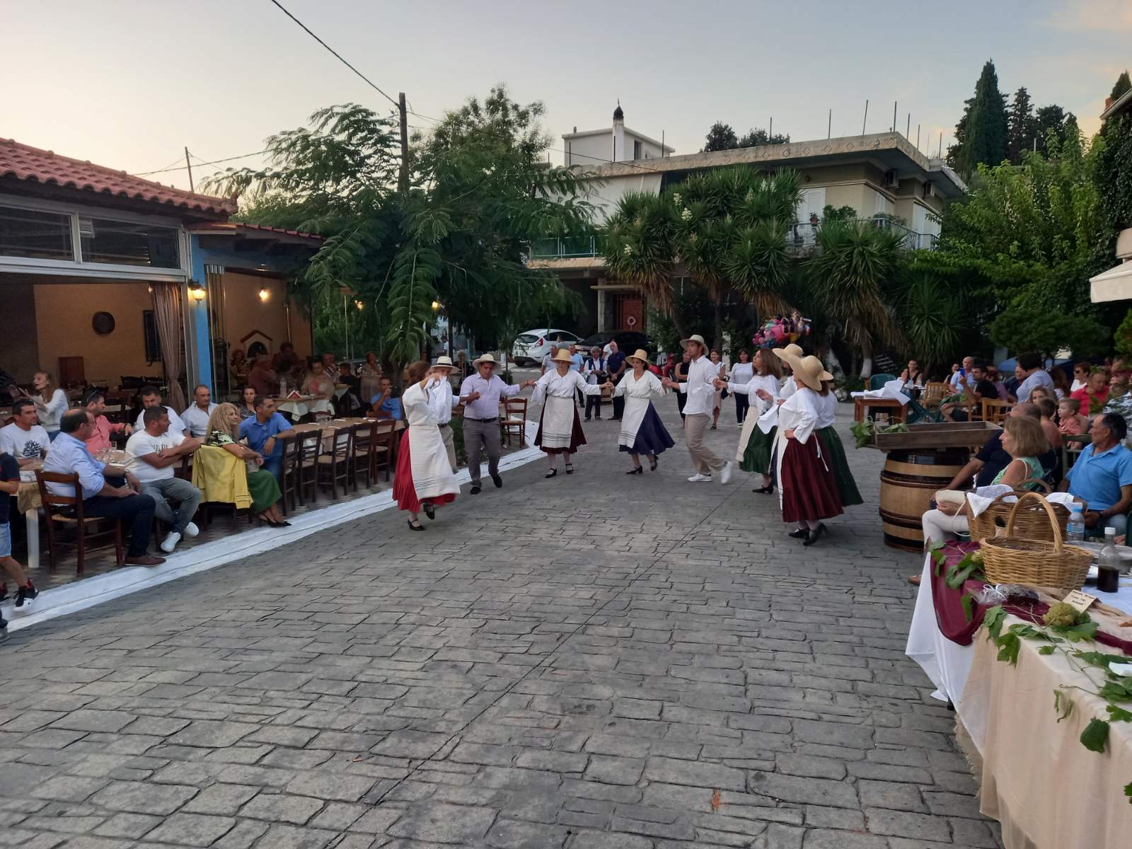 Στην πλατεία του χωριού, που φημίζεται για τα αμπέλια του και για το καλό κρασί που παράγει, είχαν στηθεί αρκετοί μπουφέδες με παραδοσιακά εδέσματα που είχαν φτιάξει με μεράκι οι γυναίκες του χωριού. Εδέσματα από σταφύλι, σταφίδα και πετιμέζι, ενώ πάνω σε βαρέλια υπήρχαν σταφύλια και πολλές ποικιλίες κρασιών, που μπορούσε να γευτεί ο κόσμος.