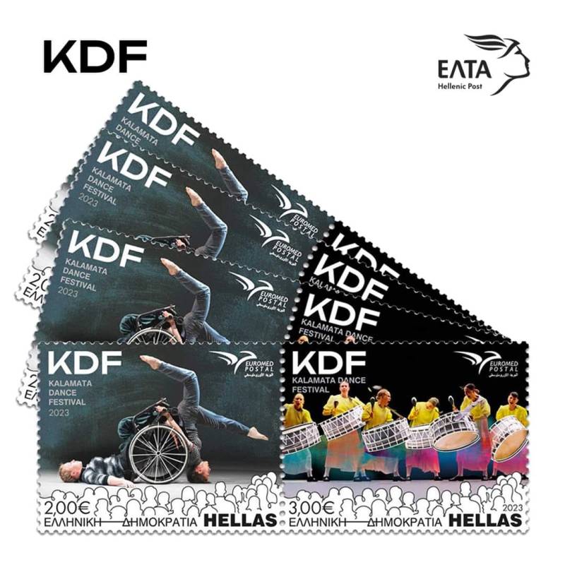 Τα γραμματόσημα αποτελούν μέρος της Ειδικής Σειράς EUROMED, η οποία εκδίδεται κάθε χρόνο από τις χώρες που περιβάλλουν τη Μεσόγειο, στο πλαίσιο της μεταξύ τους ταχυδρομικής συνεργασίας και της ενίσχυσης των ιστορικών και πολιτιστικών δεσμών τους μέσω της προώθησης του φιλοτελισμού. Η θεματολογία για το 2023 ήταν «Φεστιβάλ της Μεσογείου» και σε αυτό το πλαίσιο τα ΕΛΤΑ επέλεξαν να απεικονίσουν το Διεθνές Φεστιβάλ Χορού Καλαμάτας. Συγκεκριμένα, χρησιμοποιήθηκαν φωτογραφίες του Albert Vidal / Vèrtex Comunicació, από το ντουέτο Fine Lines της Roser López Espinosa και του Skanedans Teater και το έργο Sonoma της ομάδας La Veronal, που παρουσιάστηκαν στο 27ο και 28ο KDF, αντίστοιχα. Στα γραμματόσημα αυτά αποτυπώνεται ο δυναμισμός των χορευτικών συνόλων, η δύναμη της κίνησης, η έκφραση του σώματος μέσα από παραστάσεις ιδιαίτερες, χωρίς στερεότυπα και κοινωνικούς αποκλεισμούς.