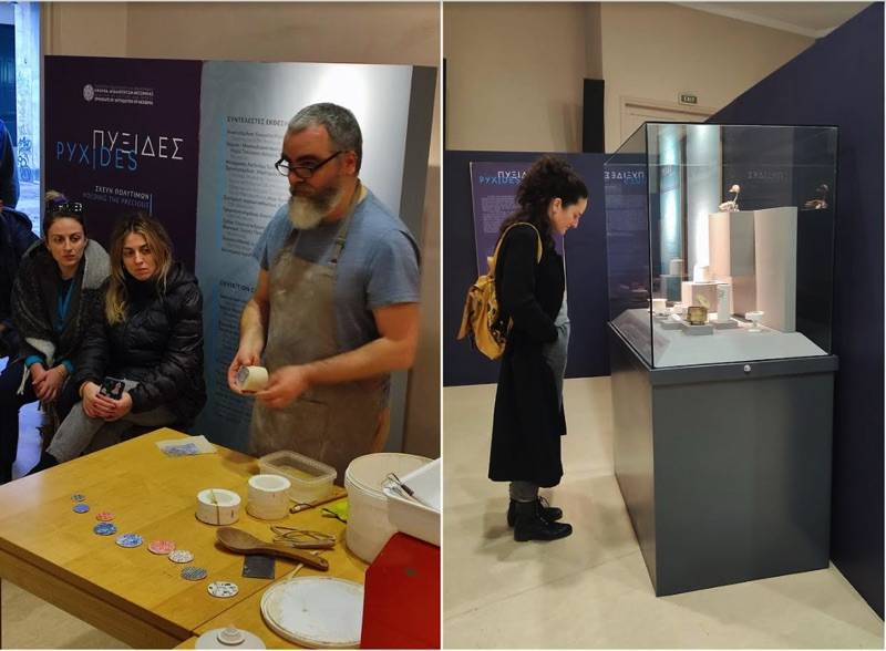Οι κεραμίστες Ηλίας Χριστόπουλος και Μάνος Καλαμένιος, ξενάγησαν το κοινό στην έκθεση και παρουσίασαν τη διαδικασία δημιουργίας των έργων τους. Η περιοδική έκθεση που εγκαινιάστηκε τον Φεβρουάριο του 2020 στην αίθουσα των εκπαιδευτικών προγραμμάτων και εκδηλώσεων του Μουσείου είχε ως θέμα τον διάλογο των αρχαίων πυξίδων με τις σύγχρονες πυξίδες, δημιουργίες των δυο καλλιτεχνών εμπνευσμένων από την αρχαιότητα.