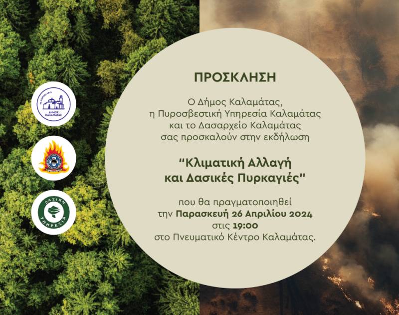 Γράφτηκε από την ΕΛΕΥΘΕΡΙΑ OnlineΕκδήλωση με θέμα “Κλιματική αλλαγή και δασικές πυρκαγιές” συνδιοργανώνουν ο Δήμος, η Πυροσβεστική Υπηρεσία και το Δασαρχείο Καλαμάτας την Παρασκευή 26 Απριλίου, στις 7