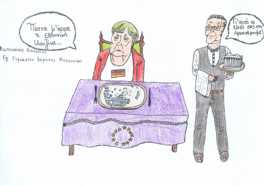 Ο Διονύσης Φωτεινάκης από το Γυμνάσιο Κορώνης είναι μαθητής της γ' τάξης και ζωγράφισε μια γελοιογραφία στην οποία η Μέρκελ κάθεται να φάει ένα πιάτο που της... σερβίρει ο Σαμαράς! Στο πιάτο βρίσκεται η Ελλάδα και η Μέρκελ σχολιάζει "Πάντα μ' άρεσε η ελληνική κουζίνα"! Ο Διονύσης ασχολείται όσο μπορεί με το σχέδιο, ζωγραφίζει, σκιτσάρει και θέλει να συνεχίσει στα μαθήματα του Ορνεράκη.