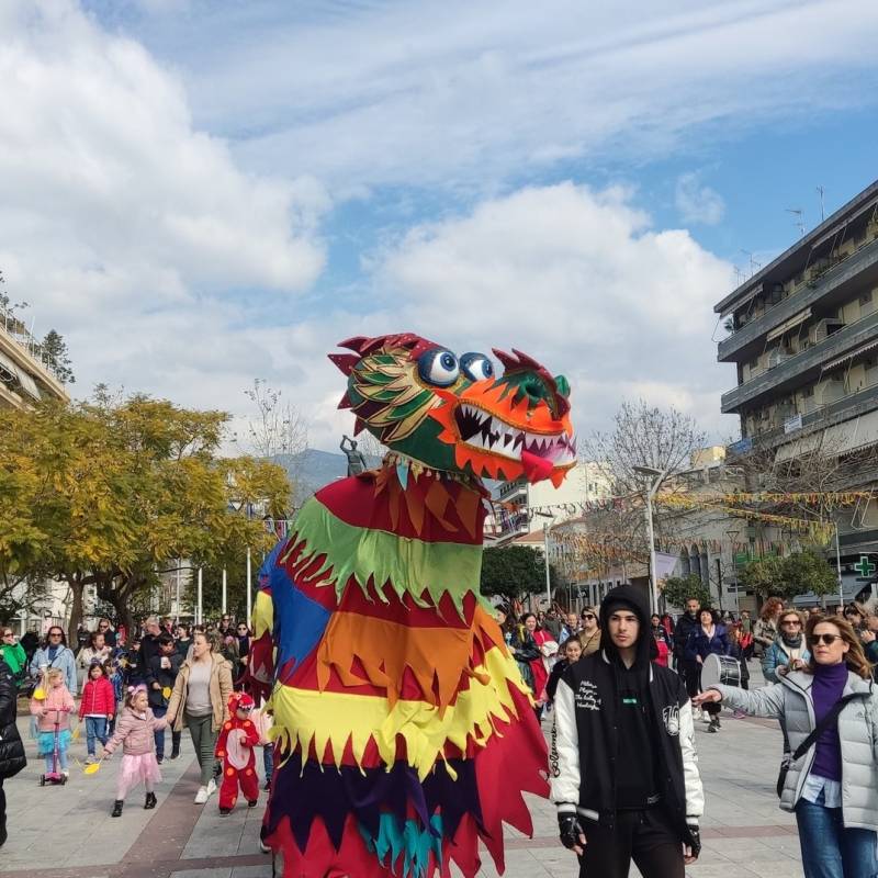 Το σημερινό πρόγραμμα στο πλαίσιο του 12ου Καλαματιανού Καρναβαλιού περιελάμβανε το δρώμενο «Ο θάνατος του δράκου και το ξύπνημα της άνοιξης» από την Πειραματική Σκηνή. Τα παιδιά μαζί με τους γονείς τους, συνόδευσαν το Δράκο στο τελευταίο του ταξίδι, πριν το “ξύπνημα” της Άνοιξης. Στη συνέχεια τη σκυτάλη πήρε το Παραδοσιακό Γαϊτανάκι, από τη Δημοτική Σχολή Χορού Καλαμάτας και το Σώμα Ελληνικού Οδηγισμού (τοπικό τμήμα Καλαμάτας). Το Γαϊτανάκι εμφανίστηκε για άλλη μια χρονιά με τις πολύχρωμες κορδέλες του που συμβολίζουν το χρόνο και τους μήνες του ημερολογιακού έτους.