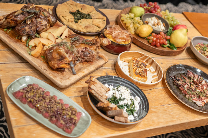 • Πιατέλα με κατσίκι ψημένο σε ανοιχτή φωτιά και αρνί χεράκι με θυμάρι και φασκόμηλο