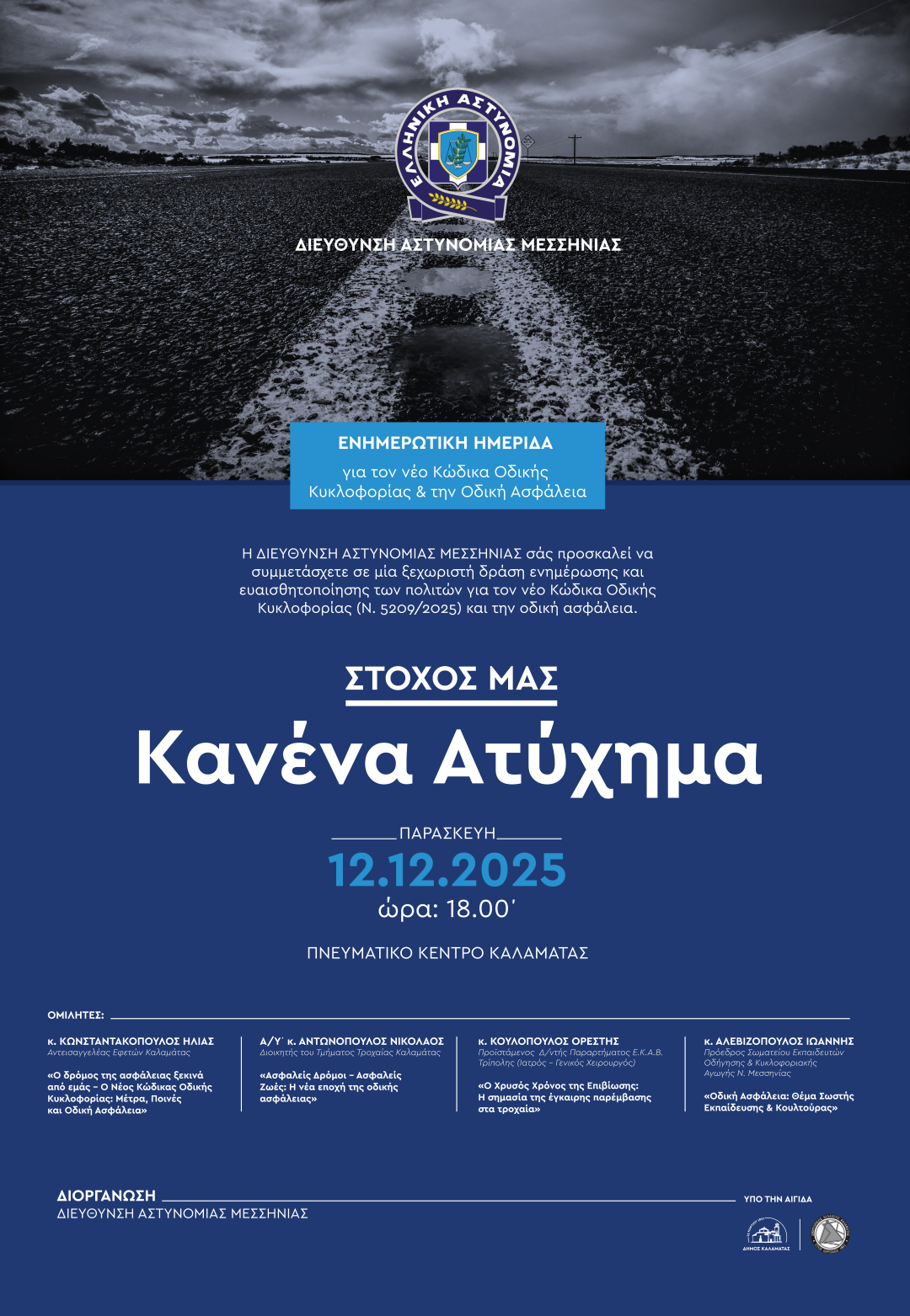 Ενημερωτική ημερίδα για τον νέο Κώδικα Οδικής Κυκλοφορίας και την Οδική Ασφάλεια με τίτλο «Στόχος μας… κανένα ατύχημα» διοργανώνει η Διεύθυνση Αστυνομίας Μεσσηνίας υπό την αιγίδα του Δήμου Καλαμάτας και του οικείου Δικηγορικού Συλλόγου.