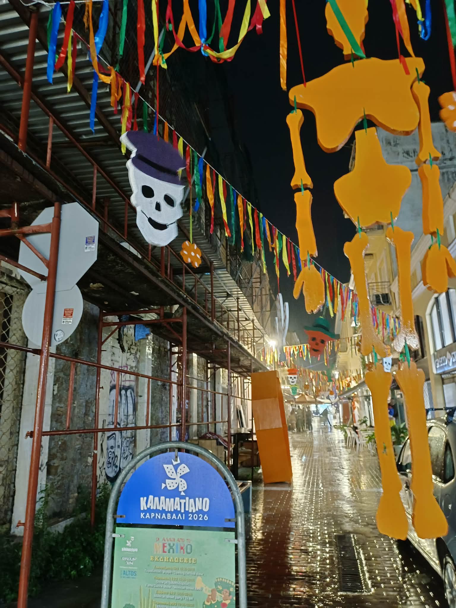 Κάθε χρόνο ο πεζόδρομος αποκτά διαφορετική θεματική ταυτότητα και φέτος «ντύθηκε» Μεξικό. Διακοσμητικά στοιχεία εμπνευσμένα από τη γιορτή Día de los Muertos -σκελετοί, νεκροκεφαλές και έντονα χρώματα- δημιουργούν μια εξωτική αλλά και ελαφρώς μυστηριώδη ατμόσφαιρα, που δίνει ξεχωριστό χαρακτήρα στις αποκριάτικες βραδιές.
