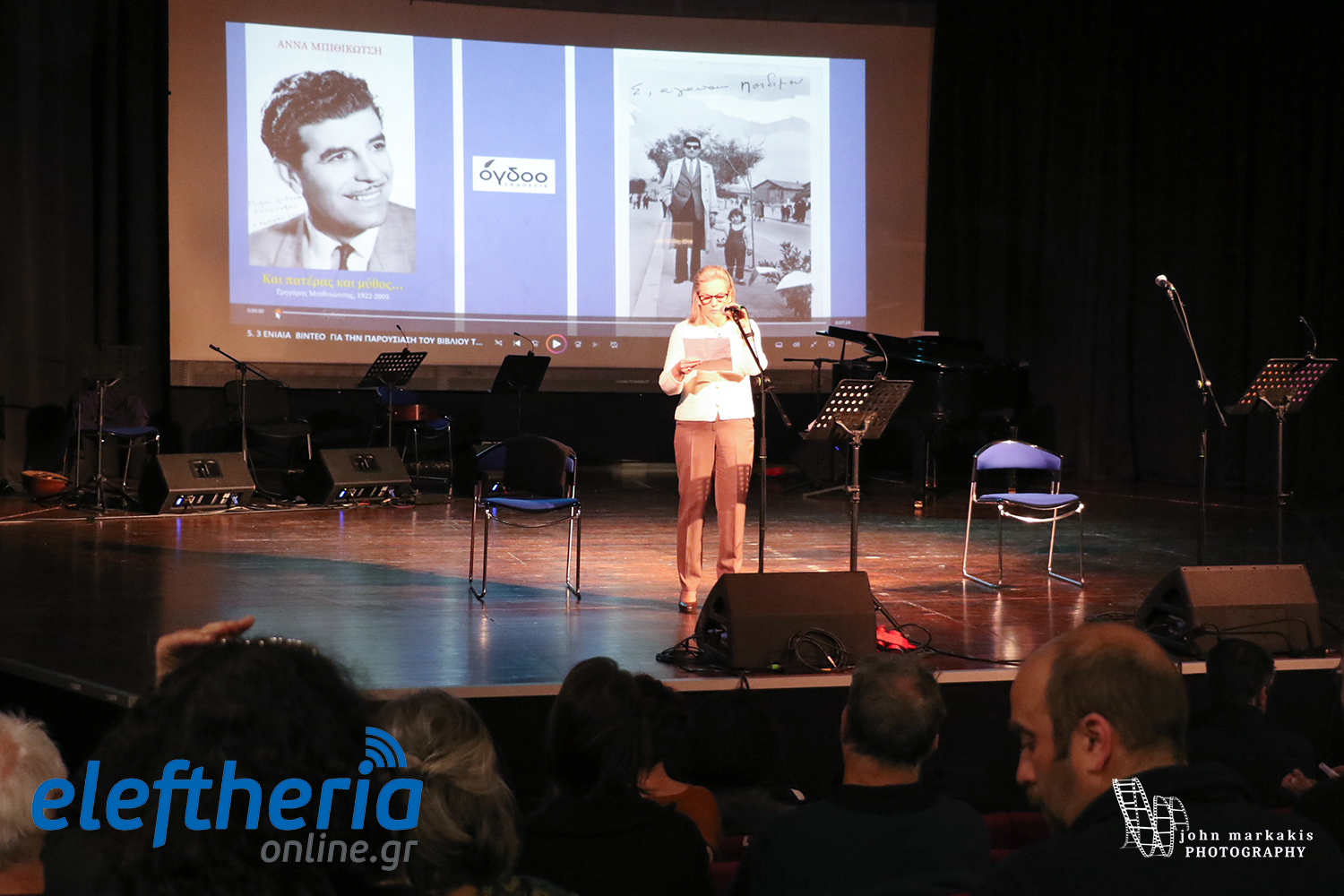 Χαιρετισμό απηύθυνε η Γενική Γραμματέας του Συλλόγου, Σοφία Καπετανάκη, ενώ για το βιβλίο μίλησαν ο καθηγητής Νίκος Βερβερίδης και η μαθήτρια Ιουλία Χρονοπούλου. Αποσπάσματα παρουσίασε αφηγηματικά η Αννα Μπιθικώτση και ο Σωτήρης Δογάνης, ερμήνευσε τραγούδια του μεγάλου λαϊκού δημιουργού.
