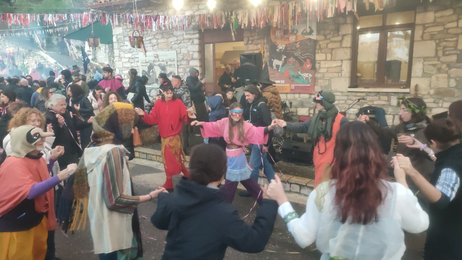 Γύρω από τη φωτιά, οι Κουμπάρες και τα Συμπεθέρια έστησαν έναν αυθεντικό αποκριάτικο χορό, παρασύροντας το κοινό μέχρι αργά. Οι μουσικοί Αντιγόνη Στάππα (λαούτο, κιθάρα, φωνή), Ελένη Κοκκάλα (ούτι, φωνή), Γεωργία Μαρίνη (βιολί), Ηλίας Μαρκαντώνης (κλαρίνο, φωνή) και Στρατής Σκουρκέας (κρουστά) έντυσαν τη βραδιά με ήχους παραδοσιακούς και ζεστούς.