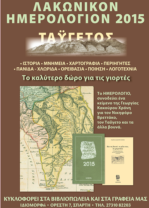 Το φετινό ημερολόγιο είναι αφιερωμένο στον Ταΰγετο. Πρόκειται για μια έκδοση 300 σελίδων που παρουσιάζει το βουνό στο σύνολό του, τη Λακωνική, Αρκαδική και Μεσσηνιακή πλευρά του (τη χλωρίδα και την πανίδα του, τα σπήλαια, τις περιοχές Natura) αλλά και πώς το είδαν οι άνθρωποι που έζησαν πάνω του ή κοντά του από τους αρχαίους χρόνους έως σήμερα (τους αρχαίους δρόμους, τα λατομεία, τα βυζαντινά μνημεία και τα μοναστήρια, τοπωνύμια, λογοτεχνία, ποίηση, οικονομία, πεζοπορικές διαδρομές, ορειβασία).