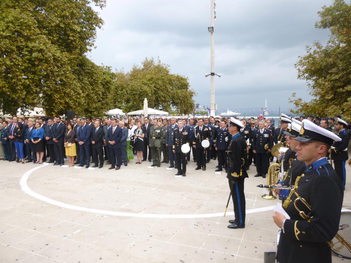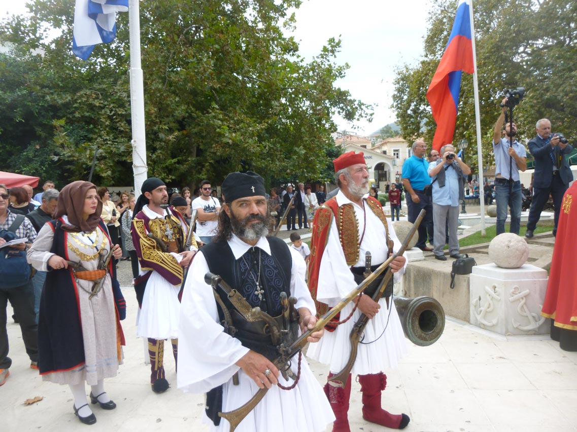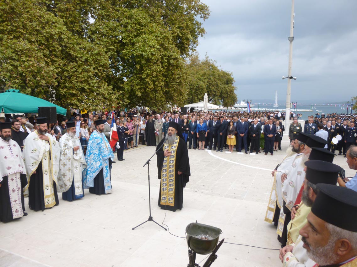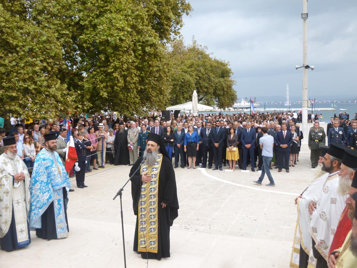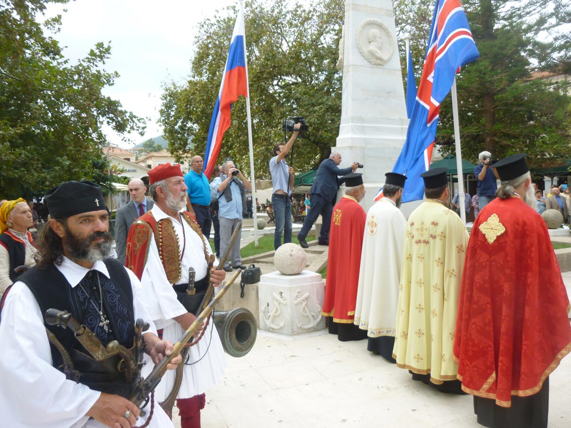 Στη δοξολογία στο ναό Κοιμήσεως της Θεοτόκου και στην επιμνημόσυνη δέηση στην πλατεία Τριών Ναυάρχων προέστη ο πρωτοσύγκελλος της μητρόπολης Μεσσηνίας - αρχιμανδρίτης Θεόκλητος Λαμπρινάκος.