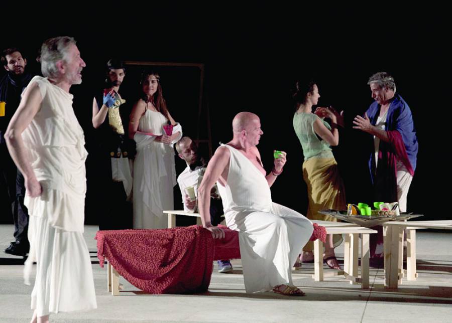 Την μεταγραφή και την απόδοση των έργων του Μενάνδρου και του Λουκιανού, που παρουσιάζονται σαν μια ενιαία παράσταση στα νέα ελληνικά έκαναν ο Χριστόφορος Χριστοφής (Μένανδρος) και ο Παναγιώτης Δημητρόπουλος (Λουκιανός). Μια διαχρονική σάτιρα «φιλοσοφίας και φιλοσόφων», που έρχεται από το χθες και φτάνει στο μέλλον με μια αναγκαστική στάση στο παρόν. Τους κεντρικούς ρόλους ερμηνεύουν ο Δημήτρης Πιατάς, ο Τάσος Παλατζίδης και ο Γιάννης Σαμσιάρης μαζί με έναν πολυπληθή θίασο και τη σκηνοθεσία υπογράφουν ο Χριστόφορος Χριστοφής (Μένανδρος) και ο Γιώργος Παπαθεοδώρου (Λουκιανός).