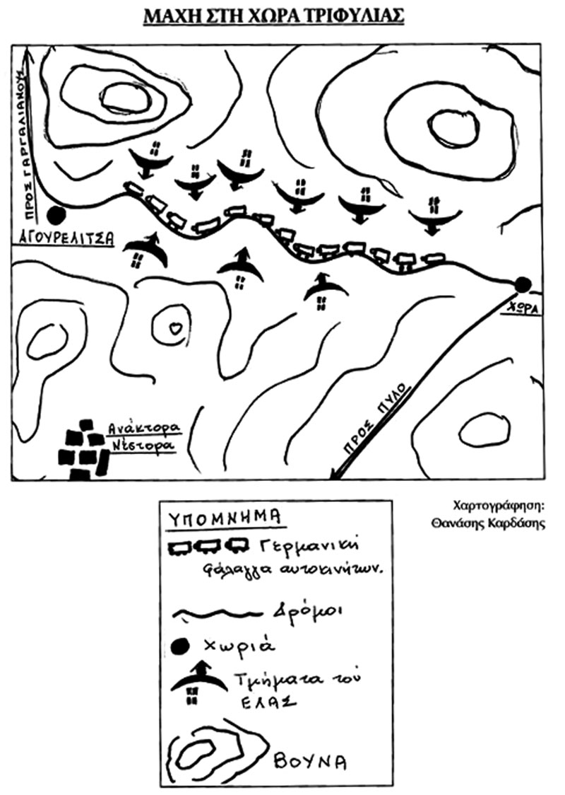 Συνεπλάκησαν το 1ο Τάγμα του 9ου Συντάγματος του ΕΛΑΣ, 130 αντάρτες, με ισχυρές γερμανικές δυνάμεις της 117 Μεραρχίας Καταδρομών, που είχαν πάρει μέρος στα μαζικά αντίποινα και στο έγκλημα του ολοκαυτώματος των Καλαβρύτων. Η τιμωρία τους επήλθε, τυχαία, στην Τριφυλία.