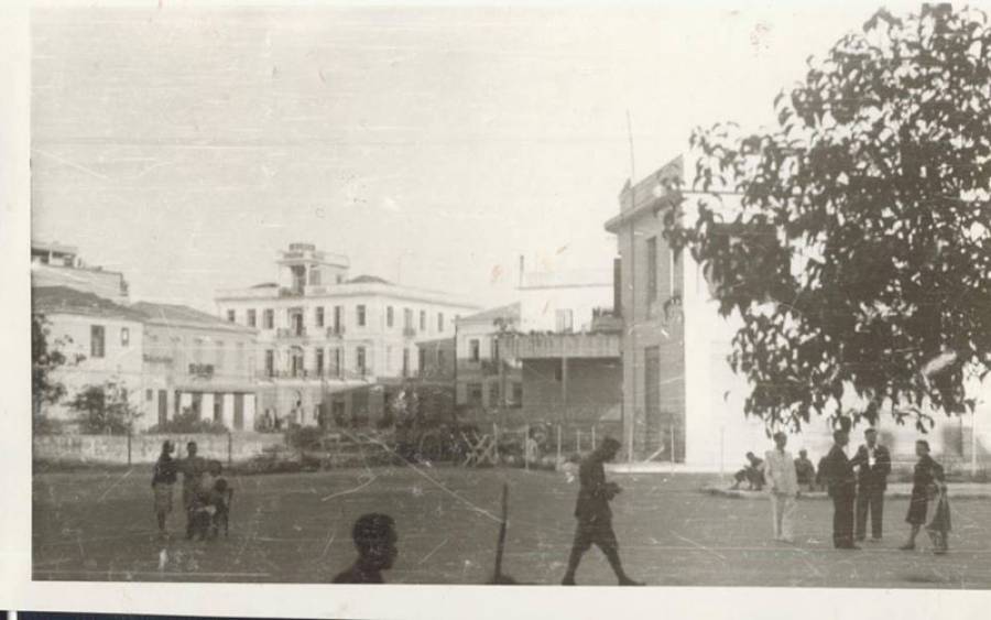 Στο βάθος διακρίνεται το ξενοδοχείο "Μεγάλη Βρετανία", δεξιά είναι το κτήριο Παπαθεοδώρου και στο βάθος αριστερά κτίσματα της Ιατροπούλου.