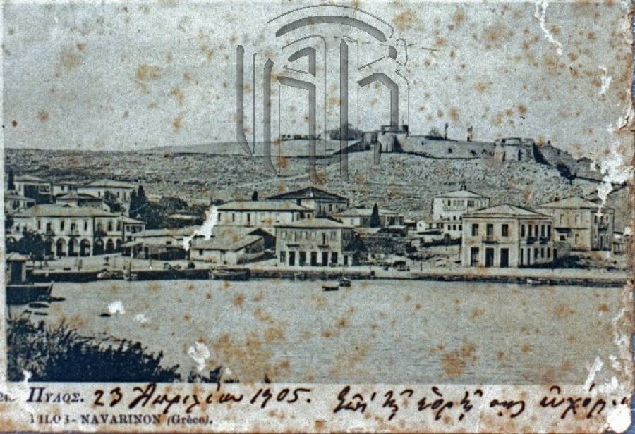Μια άποψη της Πύλου με φόντο το Νιόκαστρο, στις αρχές του 20ού αιώνα και σε καρτ ποστάλ που έχει σταλεί το 1905, όπως φαίνεται από το ευχετήριο μήνυμα.