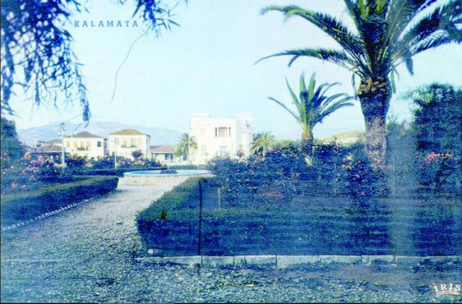 Το πάρκο της Μεσσήνης (και ας γράφει... Καλαμάτα η καρτ ποστάλ) τη δεκαετία του 1960. Στο βάθος το κτήριο της Εθνικής και τα παλιά σπίτια στη Μουλαβασίλη.