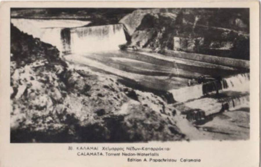 Μια σπάνια απεικόνιση των καταρρακτών του Νέδοντα, τη δεκαετία του 1930. Το νερό έχει λιγοστέψει και κάποιοι φωτογραφίζονται για τις ανάγκες της καρτ-ποστάλ, στο χείλος του καταρράκτη.