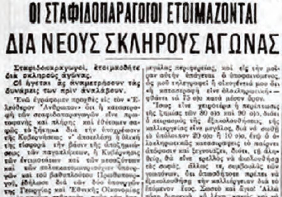 Φοβούμενη αγροτική εξέγερση η κυβέρνηση ενισχύει τις δυνάμεις της χωροφυλακής: “Πληροφορούμαστε ότι η κυβέρνηση αποφάσισε να ενισχύση τη χωροφυλακή των παγοπλήκτων περιφερειών, για να καταπνίξει βίαια κάθε εξέγερση των σταφιδοπαραγωγών και κάθε κινητοποίησή τους για την διεκδίκηση των αιτημάτων με τη δύναμή τους. Σχετικώς πληροφορούμαστε ότι ο διοικητής Χωροφυλακής Μεσσηνίας ζήτησε με εμπιστευτικό τηλεγράφημα προς το υπουργείο Εσωτερικών την ενίσχυση της Χωροφυλακής Μεσσηνίας διότι δεν αποκλείονται ζωηρές εκδηλώσεις εκ μέρους των παγοπλήκτων. Το υπουργείο αποφάσισε να στείλει την βδομάδα αυτή για την ενίσχυση της Χωροφυλακής Μεσσηνίας τριάντα εφίππους χωροφύλακες και ισάριθμους πεζούς” (516).