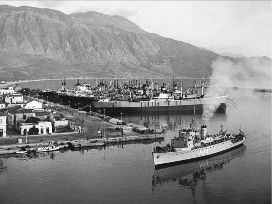 Τη δεκαετία του 1950, πολεμικό πλοίο, με κατεύθυνση τη δυτική προκυμαία, περνά ακριβώς μπροστά από το σημείο που διασταυρώνονται οι οδοί Μιαούλη και Ναυαρίνου.