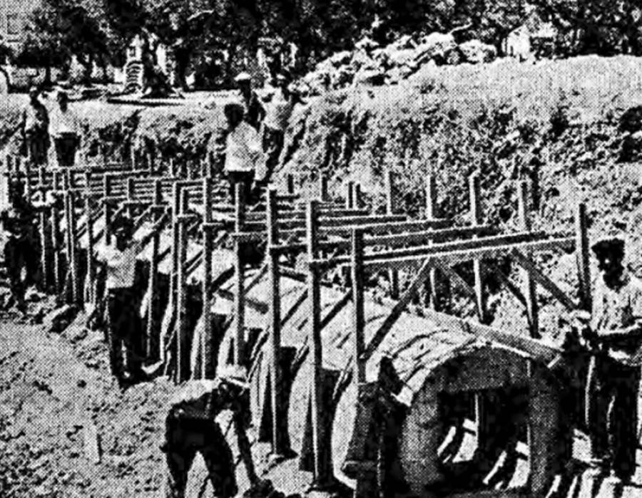 Στη φωτογραφία από το προεκλογικό πρόγραμμα του Παν. Καίσαρη το 1954, όπως δημοσιεύτηκε στις τοπικές εφημερίδες, η κατασκευή του αγωγού ομβρίων στην περιοχή του Συντάγματος.