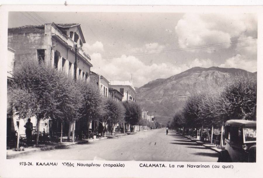 Μια εικόνα της Ναυαρίνου τη δεκαετία του 1950. Δενδροστοιχίες στις δύο πλευρές, ένα αυτοκίνητο από τα ελάχιστα που κυκλοφορούσαν, και οι στύλοι του τραμ... ορφανοί: