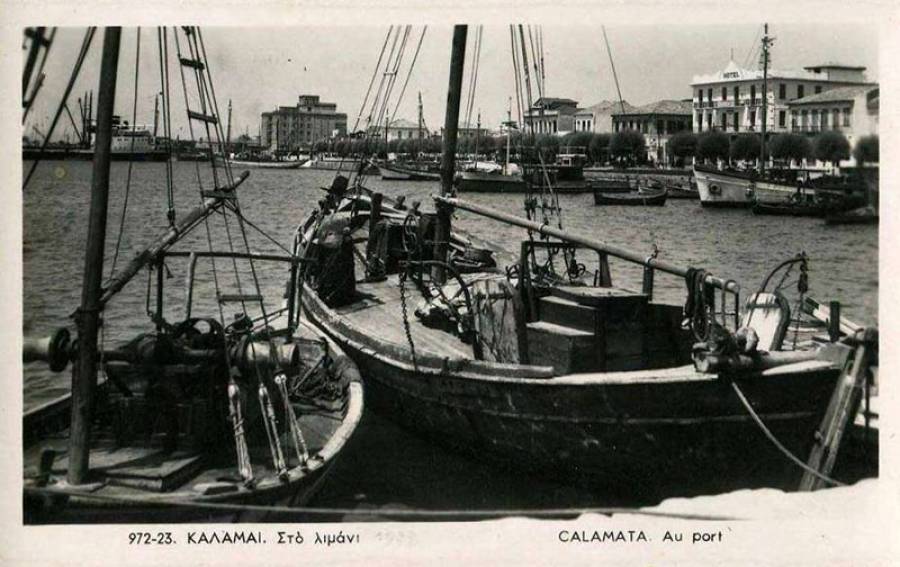 Το λιμάνι της Καλαμάτας πριν από 60 περίπου χρόνια, τη δεκαετία του 1950. Στο βάθος δεσπόζουν οι μύλοι "Ευαγγελίστριας", ενώ το ξενοδοχείο "Αμέρικα" ξεχωρίζει δεξιά στη Ναυαρίνου.