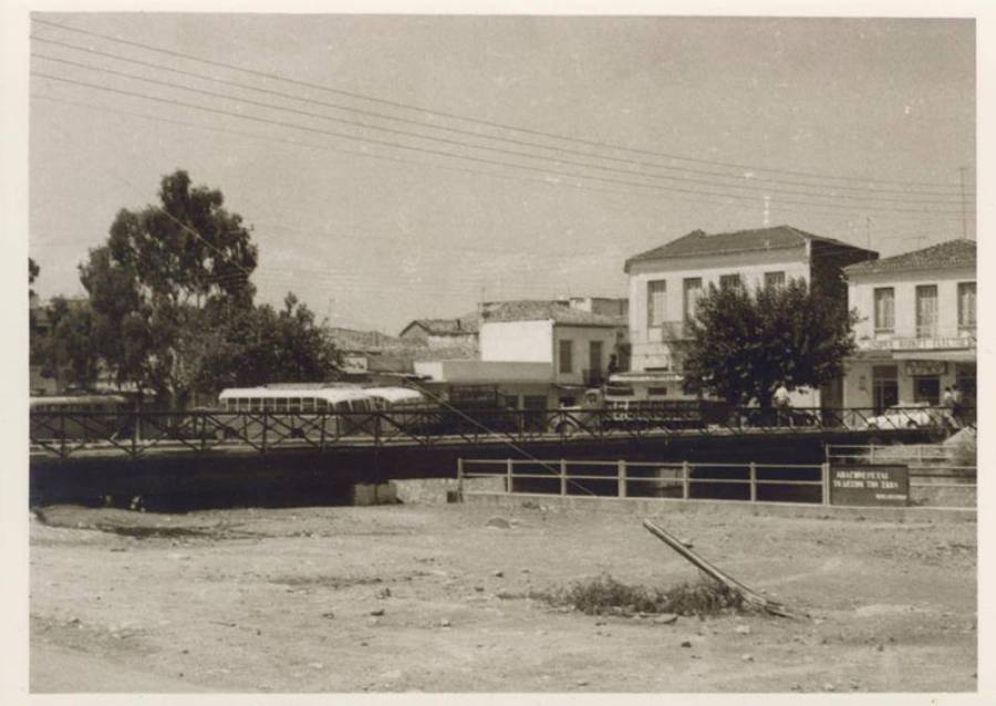 Η φωτογραφία έχει “τραβηχτεί” τη δεκαετία του 1960 και το τοπίο της γέφυρας έχει αλλάξει τελείως, μετά την κατεδάφισή της και το σκέπασμα της κοίτης.
