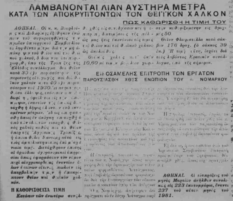 Κατόπιν τούτων ο κ. Νομάρχης απηύθυνεν χθες και νέο τηλεγράφημα προς τας κατά τόπους αστυνομικάς αρχάς, εντελόμενος όπως γνωρίσουν το συντομώτερον δυνατόν τα εν τη περιφερεία των υπάρχοντα αποθέματα θειϊκού χαλκού, αν εφαρμόζεται η διατίμησις, αν παρατηρούνται ελλείψεις κλπ.”.