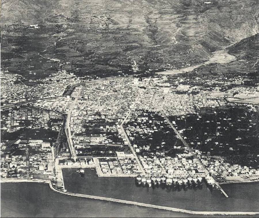 Εδώ φαίνονται 13 φορτηγά, το ένα δίπλα στο άλλο στην προβλήτα και ένα ανατολικότερα. Το κενό δόμησης ανάμεσα στην Καλαμάτα και την Παραλία εμφανές, με τις μεγάλες εκτάσεις πρασίνου. Η αεροφωτογραφία δείχνει τη μεταπολεμική διαμόρφωση της πόλης, πριν αρχίσει η έντονη ανοικοδόμηση.