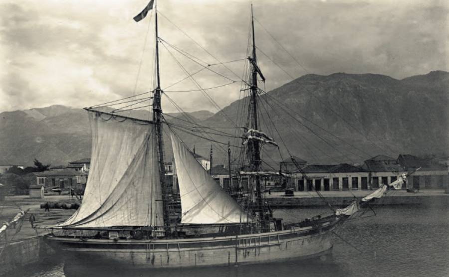 Η λήψη έχει γίνει από τη δυτική πλευρά της δεξαμενής, και στο βάθος διακρίνονται οι αποθήκες συσκευασίας σταφίδας και σύκων στην ανατολική πλευρά. Τα ιστιοφόρα ήταν το κύριο μεταφορικό μέσο από διάφορα σημεία του Μεσσηνιακού, από και προς την Καλαμάτα.