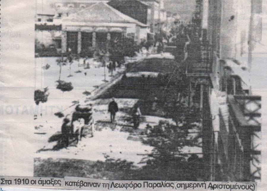 Το 1910 οι άμαξες κατέβαιναν τη λεωφόρο Παραλίας, όπως ονομαζόταν τότε η σημερινή οδός Αριστομένους.