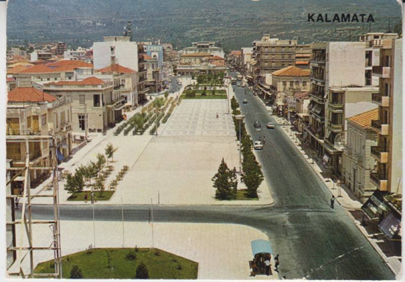 Η κεντρική πλατεία της Καλαμάτας τη δεκαετία του 1970. Ηδη έχει ολοκληρωθεί η ανάπλαση που έγινε επί δημαρχίας Κουτουμάνου και ορθώνονται πολυκατοικίες.