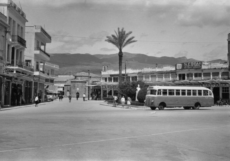 Η πλατεία 23ης Μαρτίου το 1966. Ενα μικρό κηπάριο με την προτομή του Μαυρομιχάλη, δρόμοι χωρίς αυτοκίνητα γύρω του, και στους Αγίους Αποστόλους το αστικό στη... θέση του.