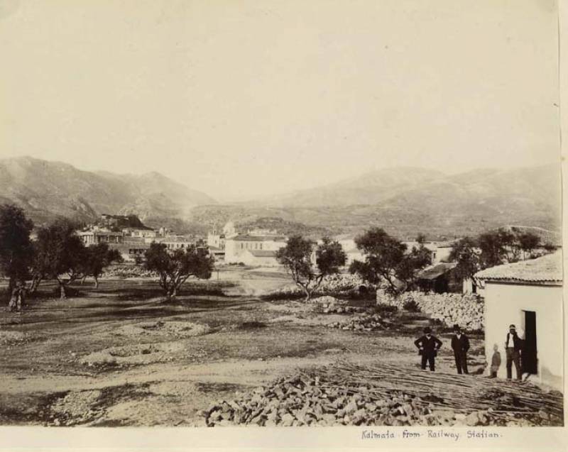 Οψη της Καλαμάτας στα τέλη του 19ου αιώνα, όταν δεν είχε ακόμη διανοιχθεί η Σιδηροδρομικού Σταθμού (1895).