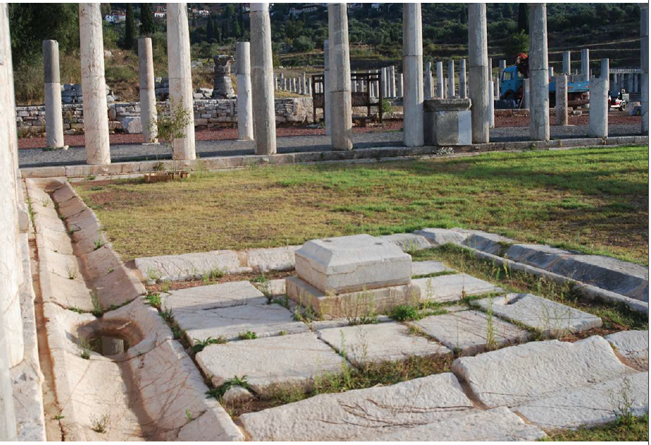 10. Η μεγάλη ορθογώνια αίθουσα, με τα μεγάλα ανοίγματα προς τη νότια στοά της Παλαίστρας, λειτουργούσε, πιθανώς, ως χώρος σφαιριστηρίου
