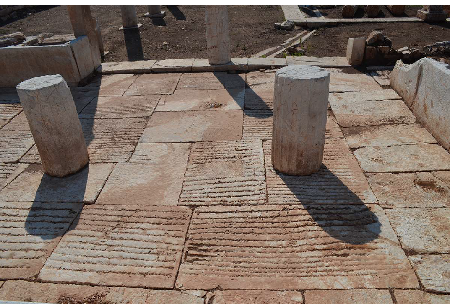 Η στέγη στηριζόταν σε τέσσερις δωρικούς κίονες, σε δεύτερη χρήση. Το πλακόστρωτο δάπεδο φέρει πυκνές αντιολισθητικές αυλακώσεις και έχει κλίση προς τον αγωγό απορροής των υδάτων, ο οποίος περνά κάτω από το κατώφλι της ανατολικής εισόδου και καταλήγει στην αύλακα των όμβριων του περιστυλίου της Παλαίστρας (εικ. 5). Τόσο οι πλάκες του δαπέδου της αίθουσας όσο και οι ορθοστάτες των λουτήρων φέρουν τεκτονικά σημεία με γράμματα της αλφαβήτου, που δηλώνουν γενικευμένη ανακατασκευή της αίθουσας ύστερα από καταστροφή, πιθανότατα από τον σεισμό του έτους 3-4 μ.Χ. της εποχής του Αύγουστου. Τότε τοποθετήθηκαν και οι τέσσερις δωρικοί κίονες ως υποστηρίγματα της στέγης. Στην πρώτη οικοδομική φάση, τη στέγη του λουτρού στήριζαν τετράγωνοι πεσσοί, όπως δείχνουν ίχνη τους στο δάπεδο.